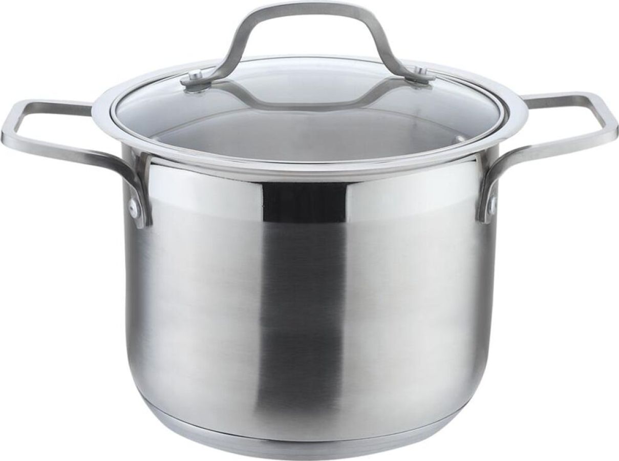 КАСТРЮЛЯ Объем 7 л Высокачественная нержавеющая сталь 5-ти слойное капсульное дно Подходит для индукции Стеклянная жаропрочная крышка с паровыпуском диаметром 22 см Удобные термостойкие клепаные ручки Матовая внутри и снаружи Мерная шкала внутри кастрюли