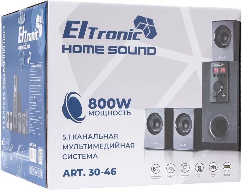 "Акустическая система 5.1 ELTRONIC HOME SOUND Режимы воспроизведения: - Bluetooth - Внешний накопитель - Aux, HDMI ARC, Optical - FM Мощность: - RMS 80 Ватт - PMPO 800 Ватт Питание: - Сеть 220V Разъемы: - USB - SD - Auх тюлпан - ARC in - Optical in Комплектация: - Комплект соединительных проводов - Пульт Д/У - Инструкция на Русском языке Размер упаковки: Ширина - 34 см Высота - 29 см Глубина - 31 см Вес-5,9 кг Дополнительно: Встроенный MP3 плеер Управление плеером прямо на колонке Led дисплей"