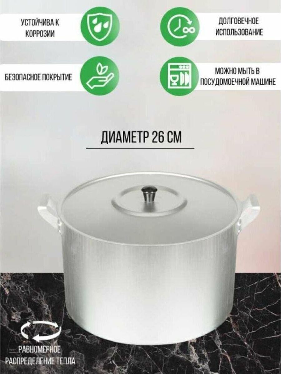 Кастрюля алюм. 10л. Диаметр 26см. Подходит для газовых плит, стеклокерамический плит и элктроплит. Можно использовать в посудомоечных машинках. Алюминиевая кастрюля применяется для приготовления различных блюд, изготовлена из пищевого алюминия, проста в уходе, быстро и равномерно нагревается. Ее преимуществами являются легкость в уходе, высокая устойчивости к царапинам, а так же возможность использования металлических аксессуаров. Поставляется вместе с крышкой соответствующего диаметра.