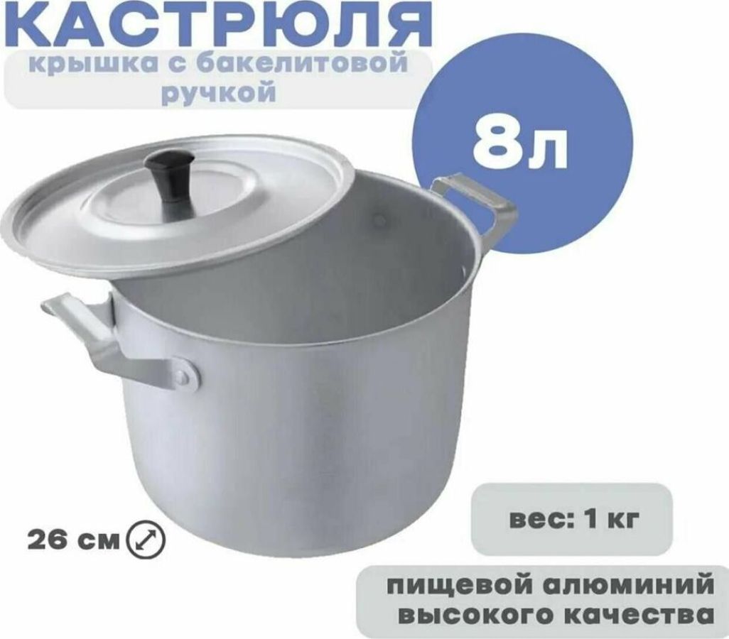 Кастрюля алюм. 8,0л. Диаметр 26см. Подходит для газовых плит, стеклокерамический плит и элктроплит. Можно использовать в посудомоечных машинках. Алюминиевая кастрюля применяется для приготовления различных блюд, изготовлена из пищевого алюминия, проста в уходе, быстро и равномерно нагревается. Ее преимуществами являются легкость в уходе, высокая устойчивости к царапинам, а так же возможность использования металлических аксессуаров. Поставляется вместе с крышкой соответствующего диаметра.
