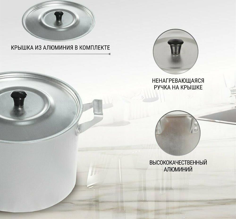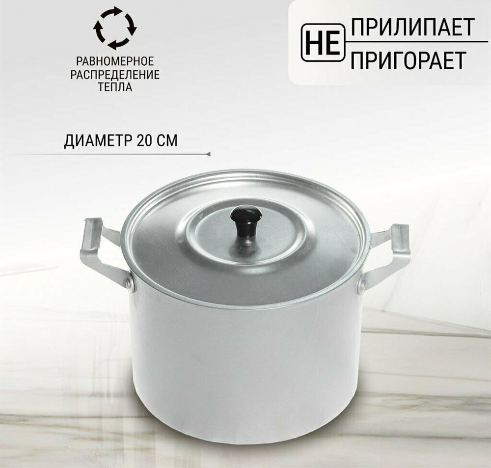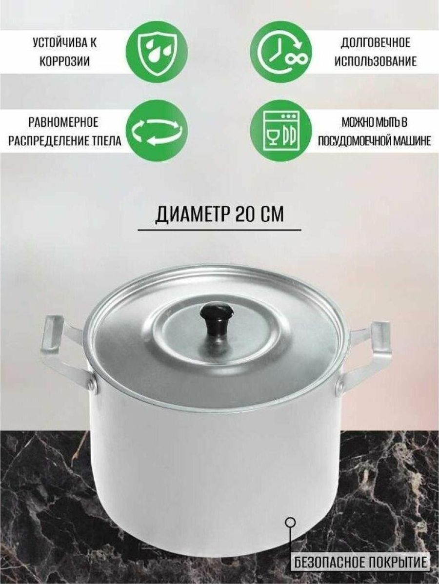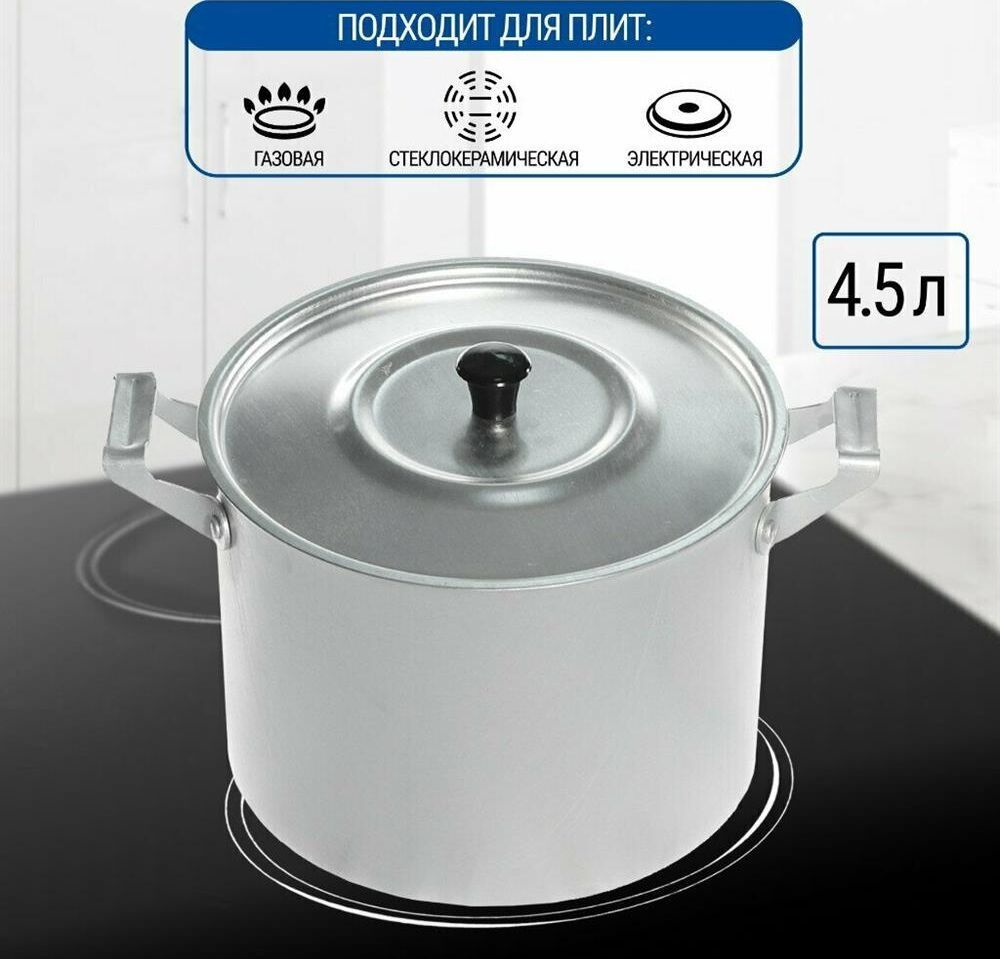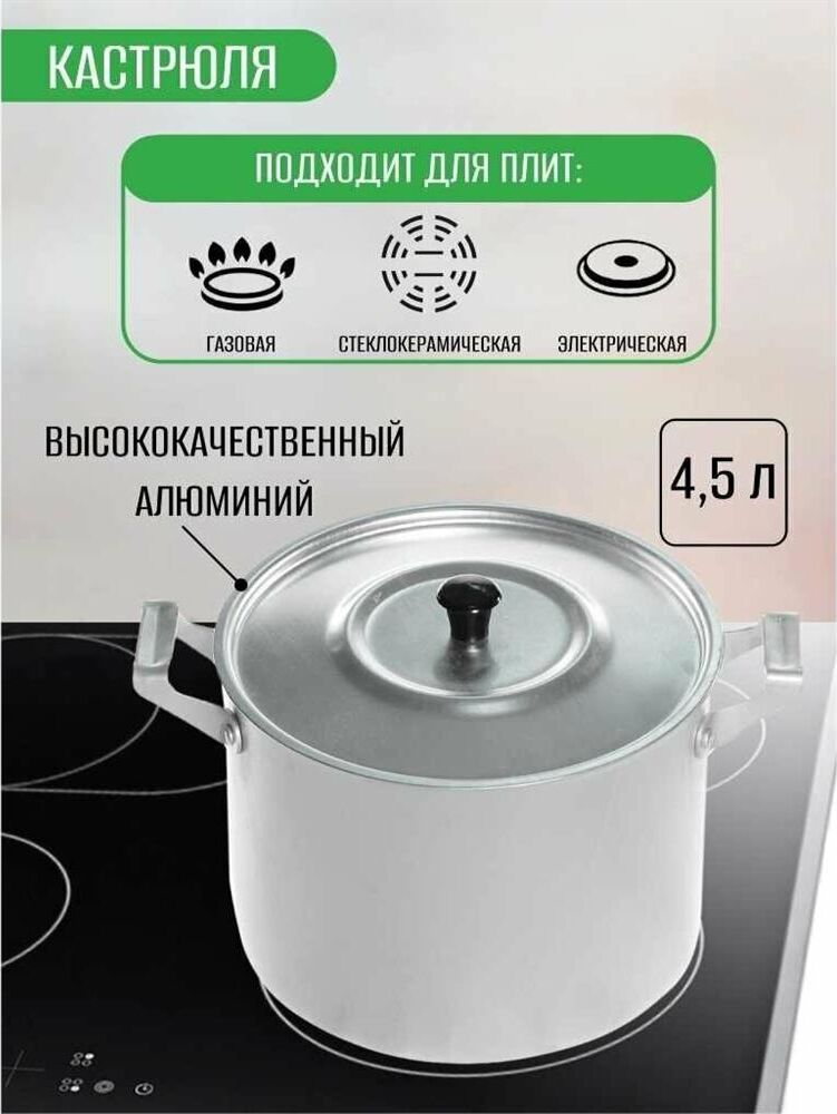 Кастрюля алюм. 4,5л. Диаметр 20см. Подходит для газовых плит, стеклокерамический плит и элктроплит. Можно использовать в посудомоечных машинках. Алюминиевая кастрюля применяется для приготовления различных блюд, изготовлена из пищевого алюминия, проста в уходе, быстро и равномерно нагревается. Ее преимуществами являются легкость в уходе, высокая устойчивости к царапинам, а так же возможность использования металлических аксессуаров. Поставляется вместе с крышкой соответствующего диаметра.