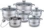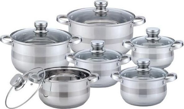 Набор посуды из 12 предметов; Кастрюля 2,1л с крышкой, диаметр: 16см; Кастрюля 2,7л с крышкой, диаметр: 18см; Кастрюля 2,7л с крышкой, диаметр: 18см; Кастрюля 3,7л с крышкой, диаметр: 20см; Кастрюля 6,3л с крышкой, диаметр: 24см; Кастрюля 7,4л с крышкой, диаметр: 26см; Высококачественная нержавеющая сталь; Стеклянные крышки с паровыпуском; 5-слойное капсульное дно; Зеркальная поверхность; Можно использовать на всех типах плит включая индукционную.