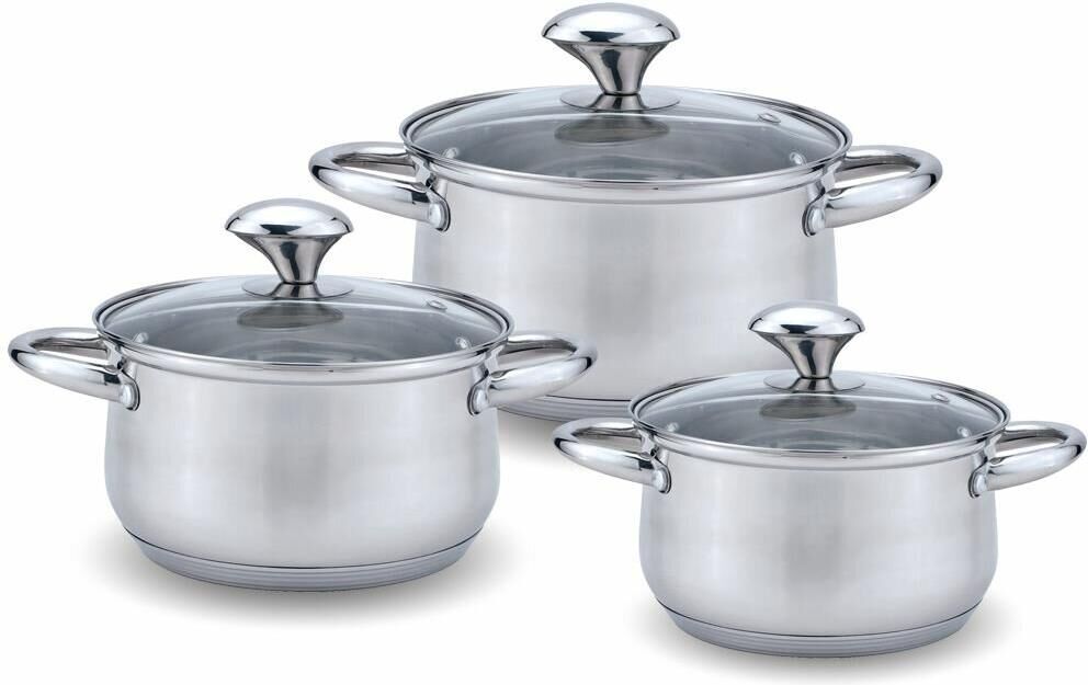 Набор из 6 предметов; Кастрюля с жаропрочной стеклянной крышкой, 2.1л; Кастрюля с жаропрочной стеклянной крышкой, 3л; Кастрюля с жаропрочной стеклянной крышкой, 4л; Мерная шкала внутри; Высококачественная нержавеющая сталь 18/10; 5-слойное капсульное дно; Можно использовать на всех типах плит, включая индукционную; Стеклянные крышки с паровыпуском; Удобные клепаные ручки не нагреваются; Посуда подходит для мытья в посудомоечной машине.