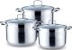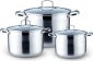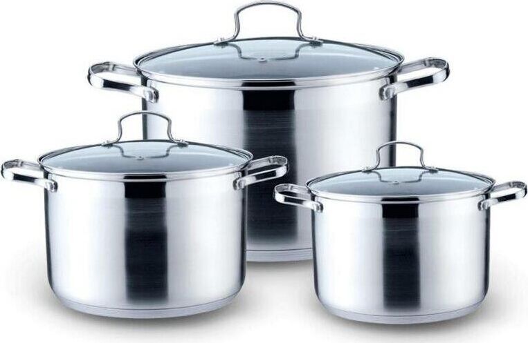 Набор из 6 предметов; Кастрюля с жаропрочной стеклянной крышкой 5л; Кастрюля с жаропрочной стеклянной крышкой 6,6л; Кастрюля с жаропрочной стеклянной крышкой 8л; Диаметр изделий составляет: 22 см, 24 см, 26 см; Высококачественная нержавеющая сталь 18/10; 5-ти слойное капсульное дно; Мерная шкала внутри; Подходит для всех видов плит, включая индукционные; Можно мыть в посудомоечной машине.