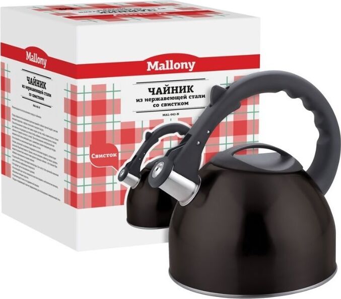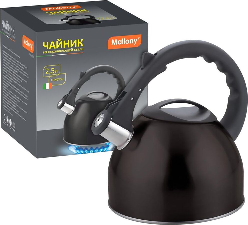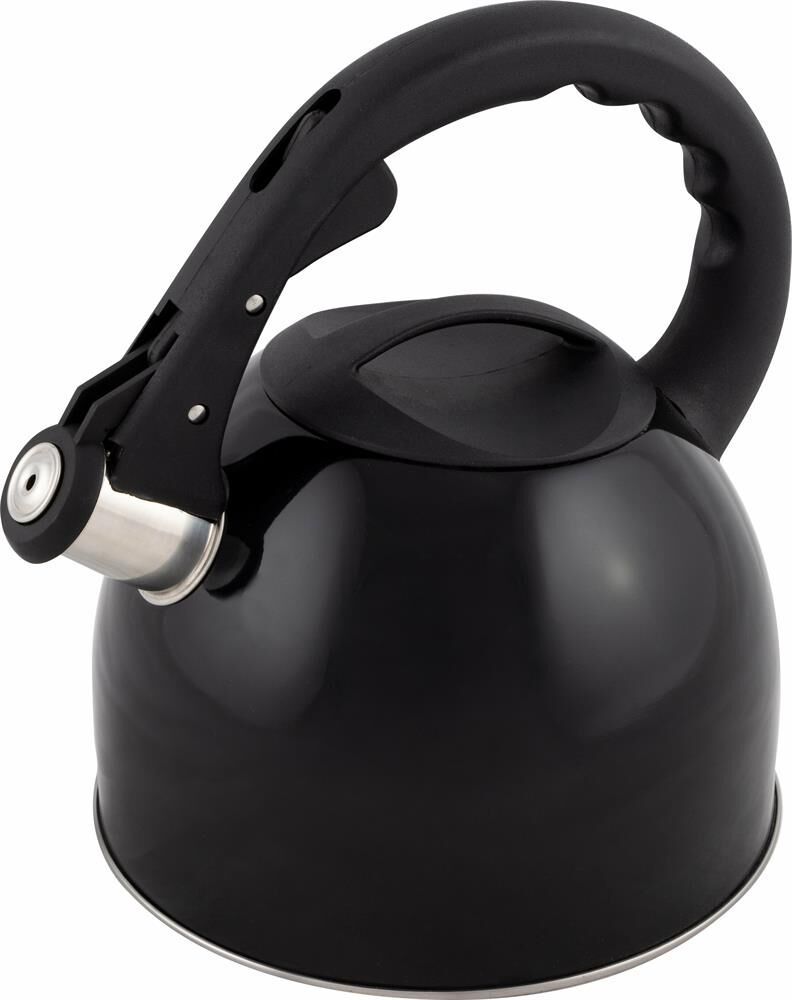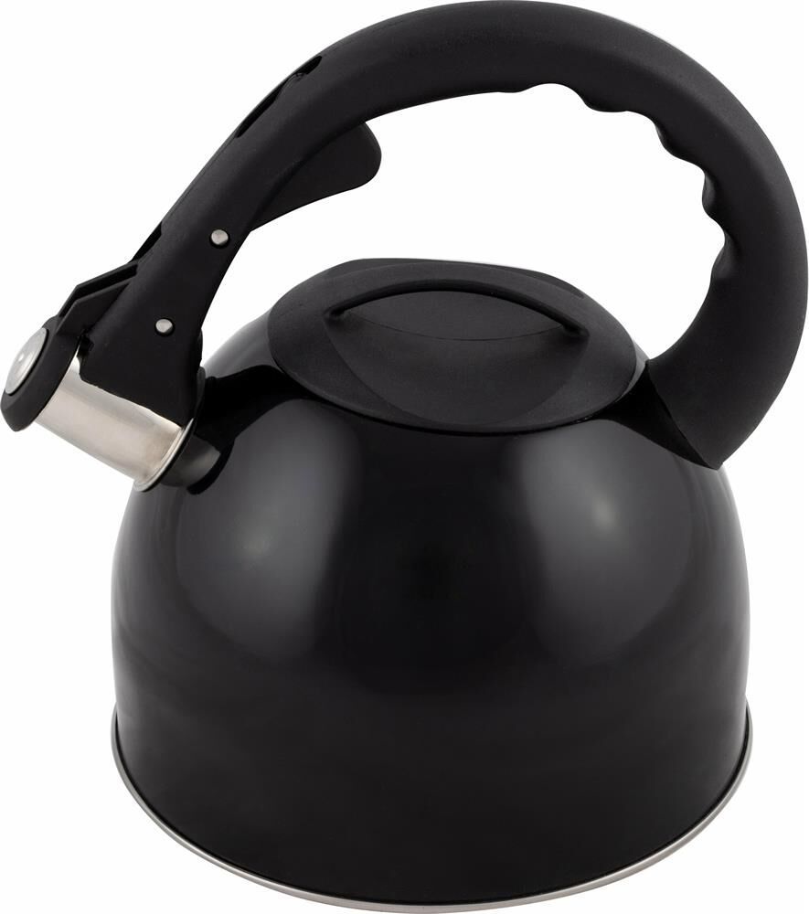 Чайник из нерж. стали со свистком Объем: 2,5 литра Материал: нержавеющая сталь, пластик (нейлон) Толщина стали - 0,4 мм Цвет:черный, глянцевый. Однослойное дно Cо свистком Подходит для всех типов плит. Не рекомендуется мыть в посудомоечной машине. Упаковка - индивидуальная цветная коробка