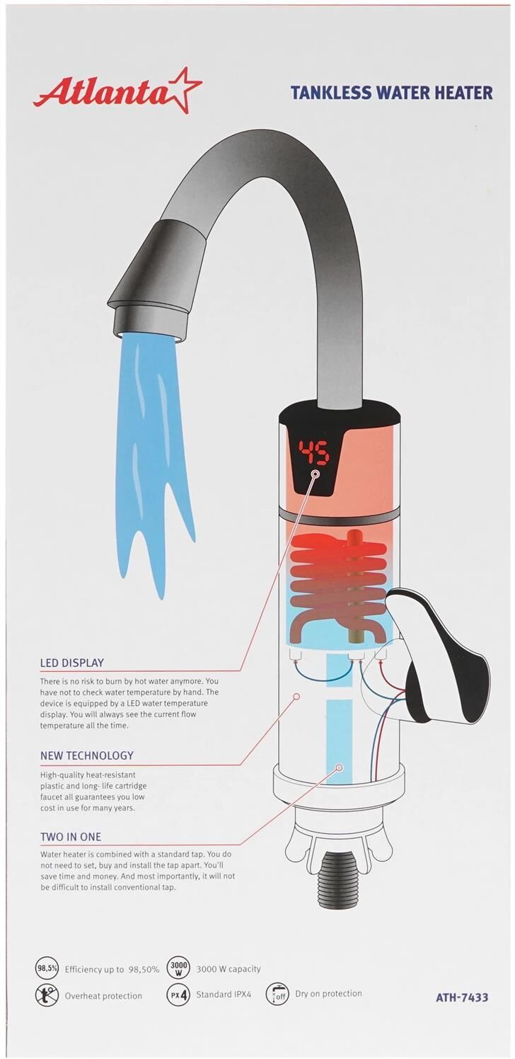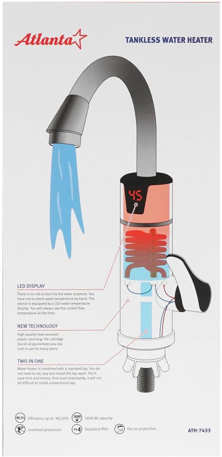 Номинальная мощность 3000 Вт LED дисплей Мгновенный нагрев потока в диапазоне 30-65 °C Работает в водопроводных сетях с давлением от 0,05 до 0,5 МPa (0,5-5 бар) Производительность: 1-3 л/мин ( 60-180 л/ч) Эффективность преобразования энергии до 98,50% Автоматическое гидравлическое управление Соответствует стандарту влагозащиты IPX4 Защита от сухого включения ТЭНа Стандартная быстрая установка Кабель питания 135 см Диаметр трубы 1/2 дюйма Защита от перегрева 230 B ~ 50 Гц