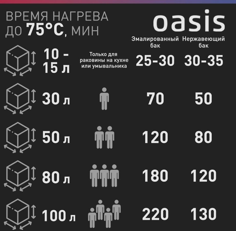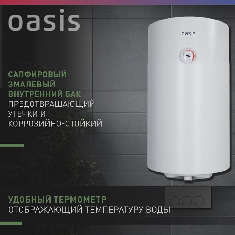 OASIS Электрический накопительный водонагреватель, круглая форма, эмалированное покрытие бака. Объем, л 50 Номинальная мощность, Вт 1600 Параметры электросети, В/Гц 220/50 Номинальное давление воды, МПа 0,8 Номинальная температура воды, °С 75 Степень защиты IPX4 Теплопроизводительность 90% Толщина теплоизоляционного слоя, мм 20 Толщина стенок бака, мм 1,8 Длина шнура, м 1,5 Тип установки Вертикальный Размер изделия, см 38 72,3