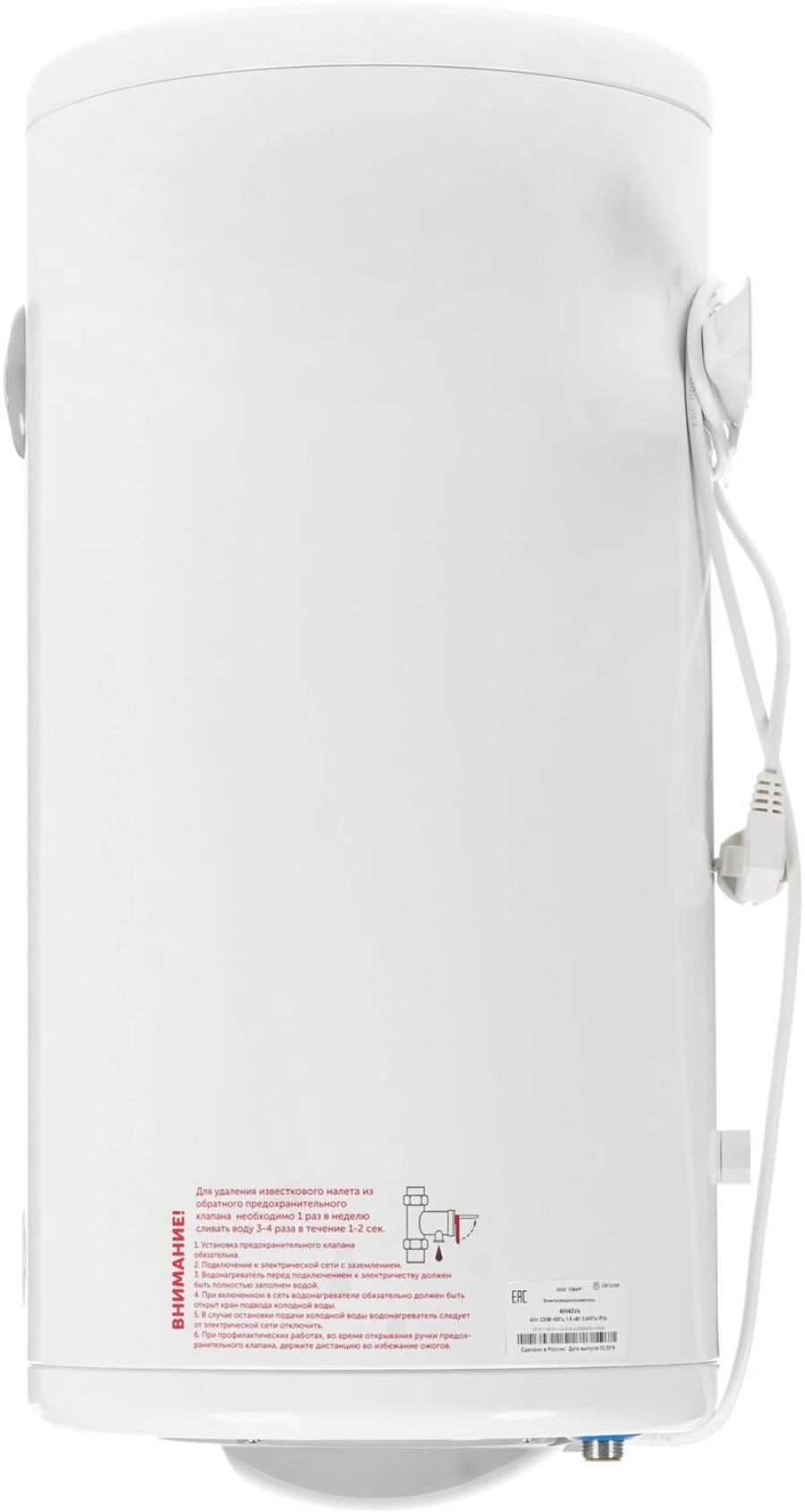 Система поддержания температуры. Световая индикация включения и подогрева. Система полной безопасности СПС безопасность. Антикоррозийный магниевый анод. Предохранительный клапан. Слой теплоизоляции, снижающий тепло- и энергопотери. Внутренний бак из нержавеющей стали Super Strong Inox. Комплектация: Электрический кабель с вилкой. Анкерные болты с гайкой. Предохранительный клапан. Техническое описание: Цвет - белый. Мощность - 1,5 кВт. Объём, л - 40. Размеры, мм - высота/диаметр – 679/330. Вес, кг - 14.