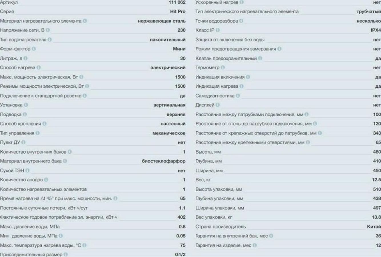 Материал нагревательного элемента нержавеющая сталь Напряжение сети, В 230 Тип водонагревателя накопительный Форм-фактор Мини Литраж, л 30 Способ нагрева электрический Макс. мощность электрическая, Вт 1500 Режимы мощности электрической, Вт 1500 Подключение к стандартной розетке да Установка вертикальная Подводка верхняя Способ крепления настенный Тип управления механическое Пульт ДУ нет Количество внутренних баков 1 Материал внутреннего бака биостеклофарфор Сухой ТЭН нет Количество анодов 1 Количество нагревательных элементов1 Макс. температура нагрева воды, °С 75 Присоединительный размер G1/2 Ускоренный нагрев нет Тип электрического нагревательного элементатрубчатый Точки водоразбора несколько Класс IP IPX4 Защита от включения без водынет Режим предотвращения замерзания нет Клапан предохранительный да Термометр нет Индикация включения да Индикация нагрева да Самодиагностика нет Дисплей нет Высота, мм480 Глубина, мм410 Ширина, мм450 Вес, кг12.5
