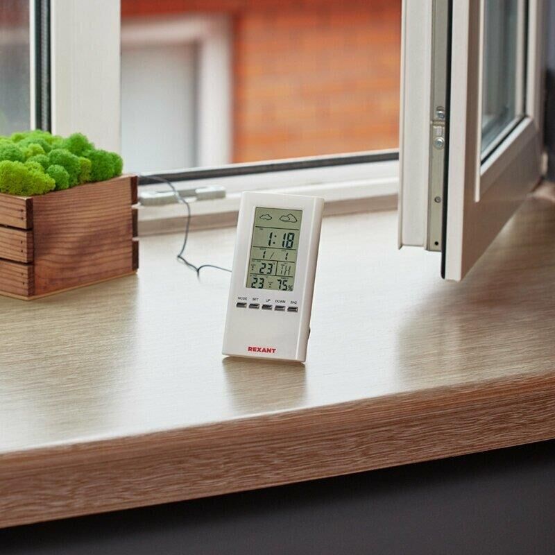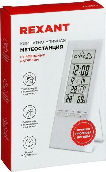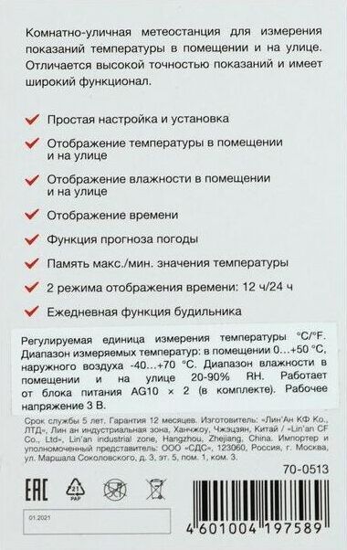 Технические характеристики: Отображение температуры в помещении и на улице, отображение влажности в помещении. Отображение времени. Единица измерения температуры изменяемая. Память максимального / минимального значения температуры. 2 режима отображения времени: 12ч / 24ч. Ежедневная функция будильника. Стимулирующий прогноз погоды. Диапазон температур: Температура в помещении: 0 С + 50 С Температура наружного воздуха: -40 С +70 С Диапазон влажности: в помещении 20% RH 90% RH Блок питания: AG10 x1 (в комплекте)