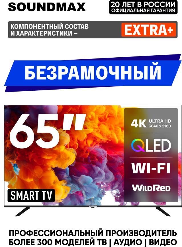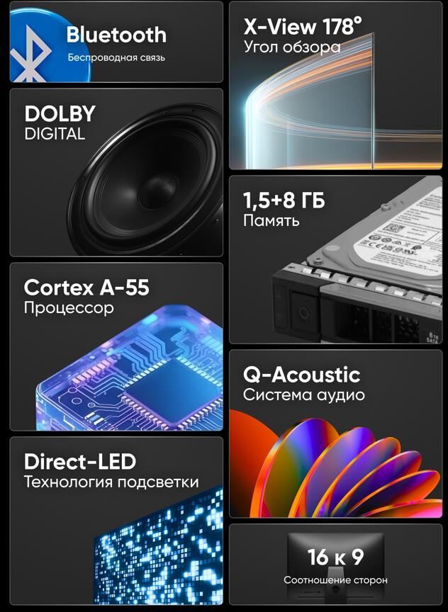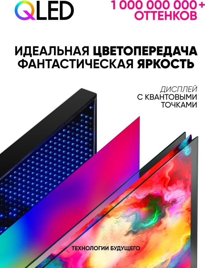 Диагональ дисплея 65" (165 см) Разрешение 3840 х 2160 Тип экрана Безрамочный Яркость (кд/м2) 285 Контраст 1300:1 Время отклика (мс) 8 Технологии изображения HDR / QLED Формат 16:9 Углы обзора (верт. х гориз.) 178 x 178 Поверхность Глянцевая Стандарт вещания DVB-T / DVB-T2 / DVB-C / DVB-S / DVB-S2 / Аналоговый Системы звука BG / DK / I Система цветности PAL / SECAM Количество каналов 199 аналоговых, 400 цифровых, 1000 спутниковых Операционная система Android 11 Процессор ARM Cortex-A53, 1.5 ГГц, 4 ядра Графический процессор ARM Mali-G52 MP2, 500 МГц, 2 ядра Оперативная память 1.5 ГБ Встроенная память 8 ГБ (часть встроенной пямяти занимает ОС) Wifi 2,4 ГГц Порт Ethernet (LAN) 10/100 Мбит HDMI 3 шт. / (2.0) HDMI функции CEC / ARC Встроенный порт USB 2 шт. / (2.0) CI порт CI+ (1.4) Выходы стерео аудиовыход (3,5мм) / оптический аудиовыход (Toslink) Входы стерео аудио + композитный видео вход (3,5 мм) Питание ~110-240 В Настенное крепление VESA 300 х 300 Мощность динамиков 2х8 Вт Цвет Черный
