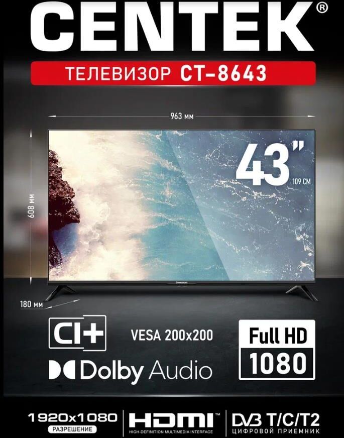 Размер панели 43’’ (Full HD). Макс. разрешение 1920 х 1080. Соотношение сторон 16: 9. Контрастность 1200: 1. Яркость 220 кд/м2. Частота обновления 60 Гц. Напряжение 220-240 В; 50/60 Гц. Аудиовыход 2х8 Вт. Мощность 65 Вт. Вес нетто/брутто (кг)6.8 / 8.5. Угол обзора (L/R)170/170. Видео стандартыPAL/SECAM. Расстояние между креплениями/тип болта 200x200/M6. Частота обновления (Гц)60. Время отклика (TR+TF/TYPE) (мс)6.5. Операционная система Non-OS. Объем модуля памяти DDR (Мб)128 Flash-память (Мб)8. Цифровые тюнерыDVB T/T2/C. 3D-гребенчатый фильтр есть. Динамическое шумоподавление есть. Баланс есть. Стерео NICAM/A2. Таймер сна есть. Родительский контроль есть.