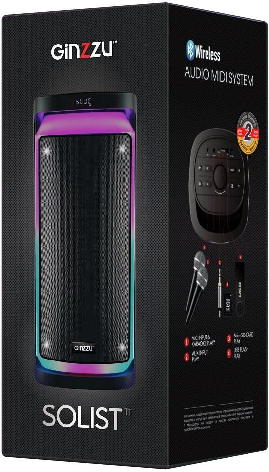 модель SOLIST ДИНАМИКИ: НЧ/СЧ/ВЧ - 2 х 6.5 + 3 дюймов. КАРАОКЕ функция - 2 х микрофона DC-jack 6,5 мм. ДИНАМИЧЕСКАЯ RGB подсветка динамиков. ЭКВАЛАЙЗЕР: POP, ROCK, JAZZ, CLASSIC, FLAT. Встроенный аккумулятор Li-Ion, 7.4В, 4500 мАч. BLUETOOTH: V5.0. Поддержка режима TWS. FM РАДИО: 87,5-108,0 МГц. АУДИО-ПЛЕЕР: USB-flash и микро SD-card. AUX: DC-jack 3,5 мм. Пульт дистанционного управления. Диапазон воспроизводимых частот: 50 Гц - 18 КГц. ГАРАНТИЯ 2 ГОДА.