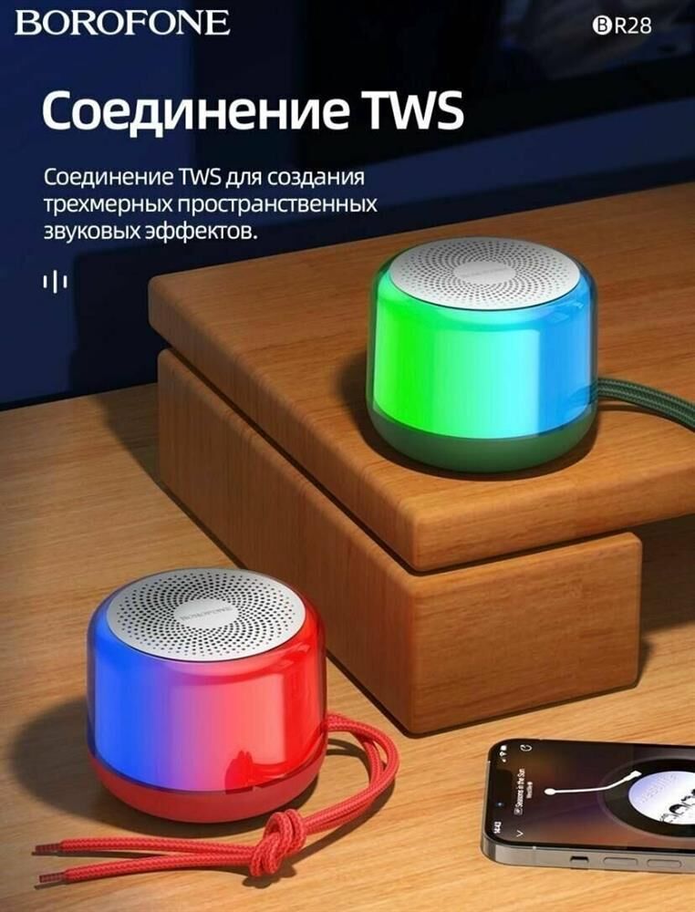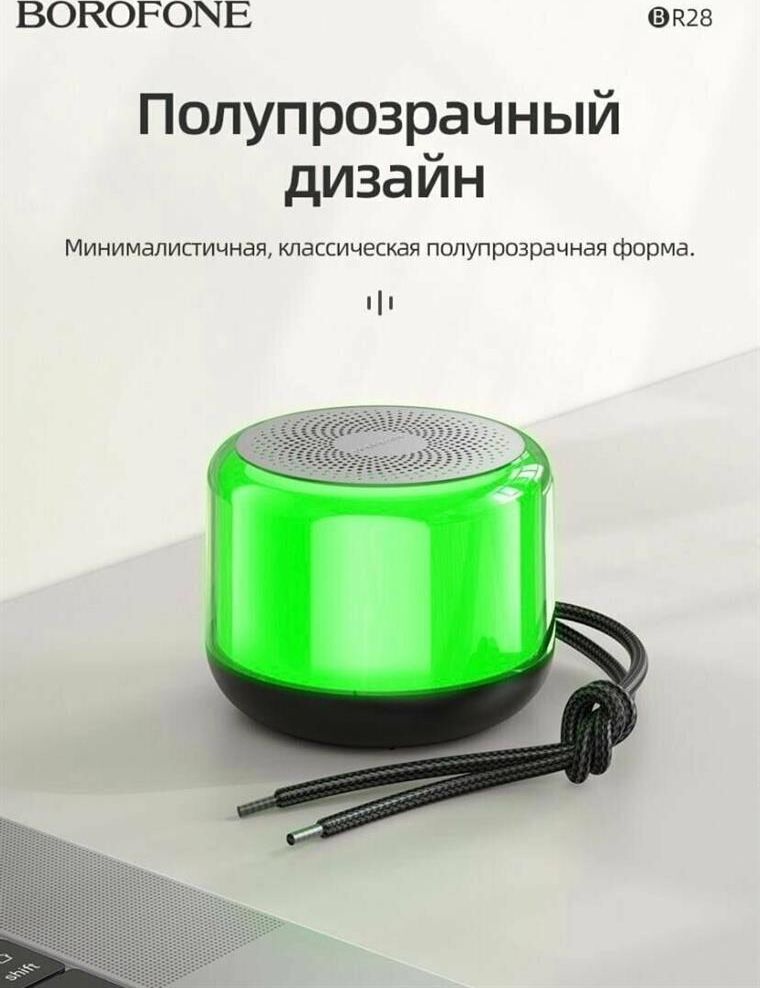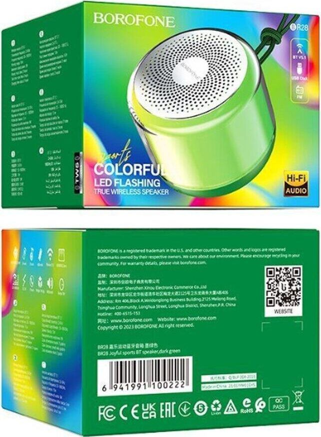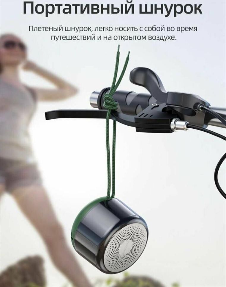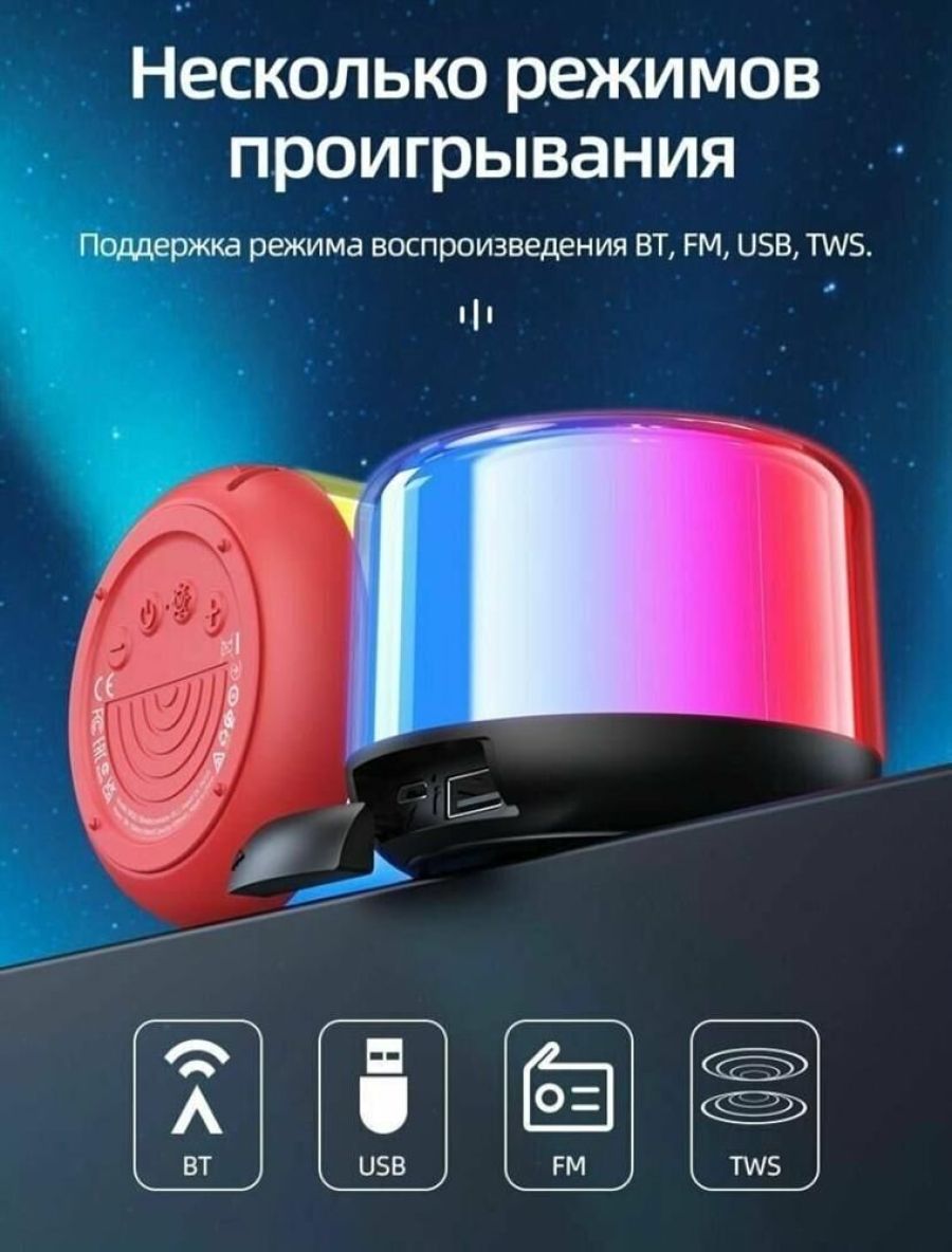 Беспроводная колонка, Bluetooth версии 5.1, даёт возможность прослушивания музыки с флеш карт USB, и имеет режим FM-радиоприемника. Емкость аккумулятора 600мАч - заряда хватит на 2 часа активного использования колонки.