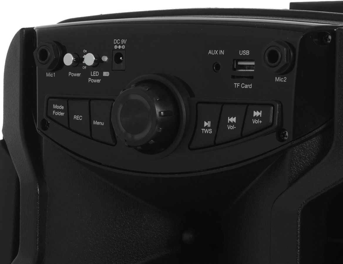 Мощность (RMS) 20 Вт. Емкость батареи 7.4 В, 1800 мАч. Тип аккумулятора Li-ion. Время зарядки До 4 часов. Время автономной работы До 1.5 часов. Версия Bluetooth 5.0+BR+EDR+BLE. Дальность действия 10 м. TWS Нет. Эквалайзер Да. Подсветка Да. FM-радио Да. Поддержка HANDS-FREE Нет. Функция Powerbank Нет. Влагозащита Нет. Максимальный размер USB-входа для флэш-памяти 128 ГБ. Разъемы USB, AUX, Micro SD. Ручка для переноски Да. Пульт ДУ Да. Беспроводной микрофон Нет. Габариты (ШxВxГ) 254 х 420 х 268 мм. Комплектация Портативная акустика, зарядное устройство, пульт ДУ, руководство по эксплуатации, гарантийный талон. Вес нетто 4.15 кг.