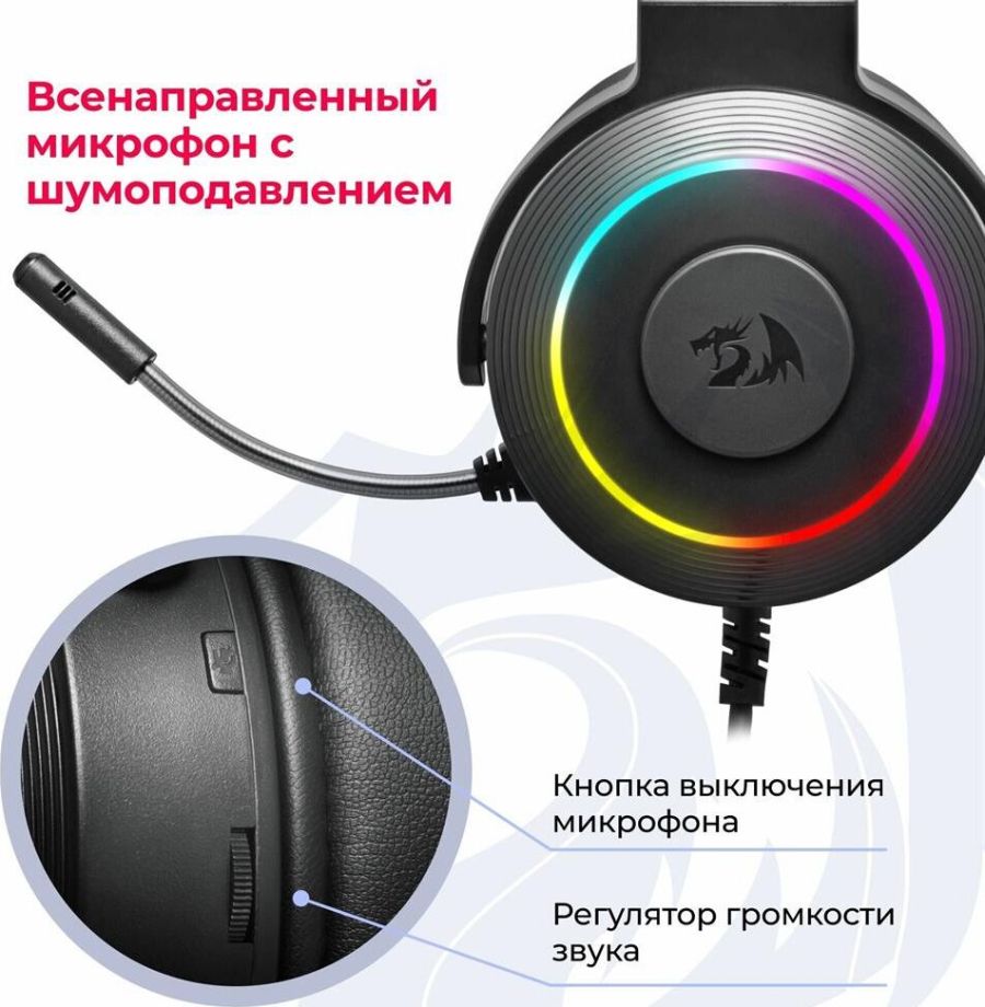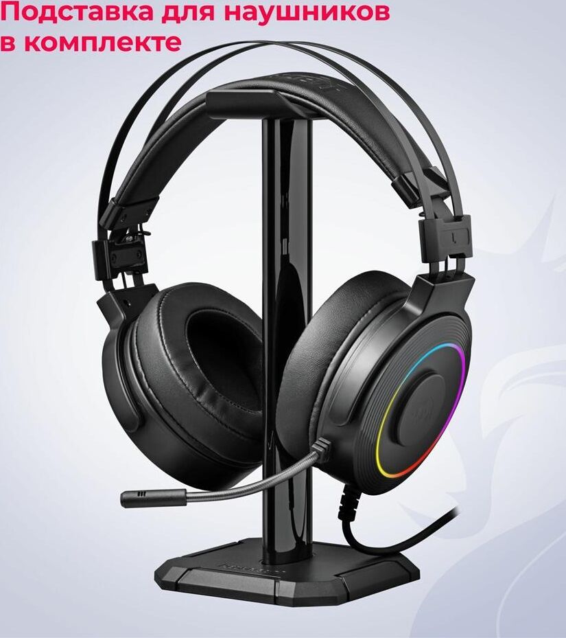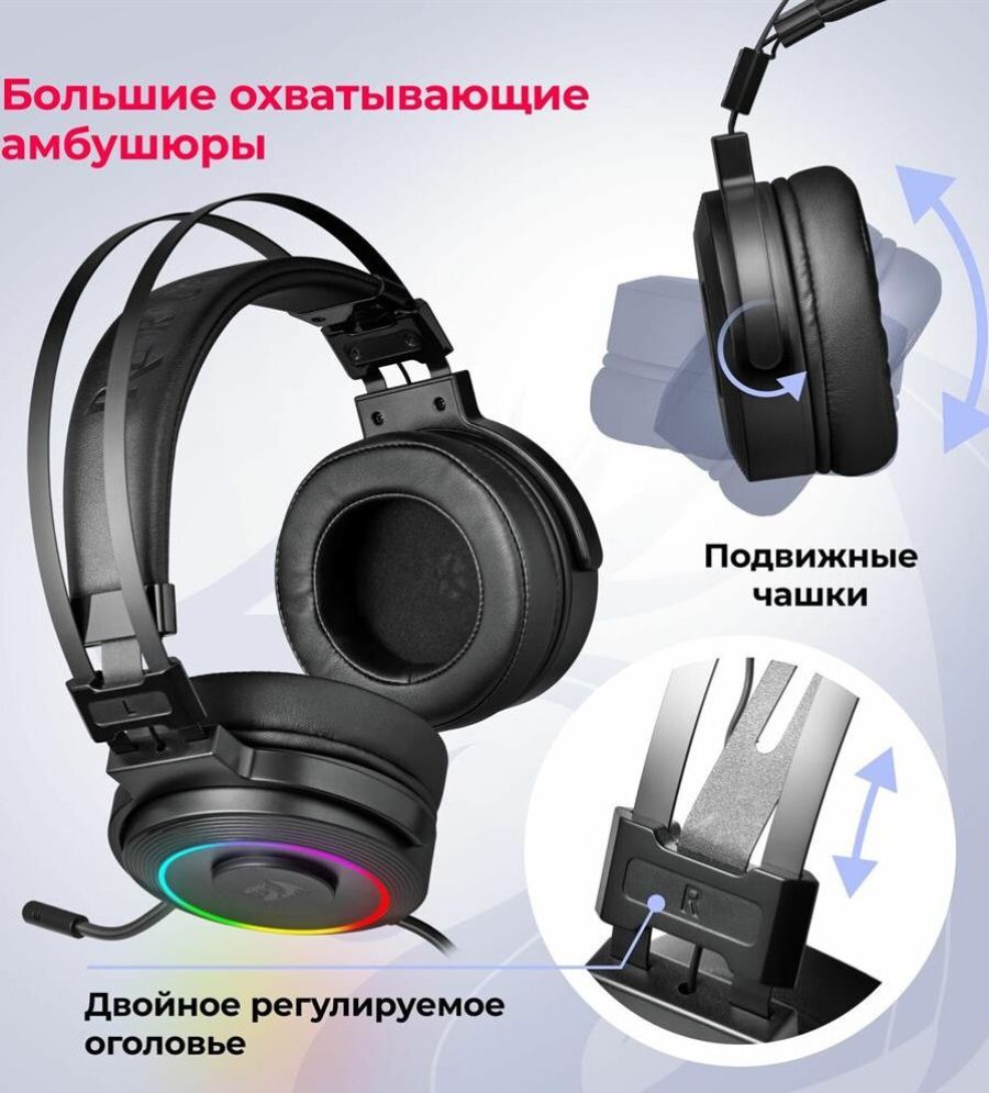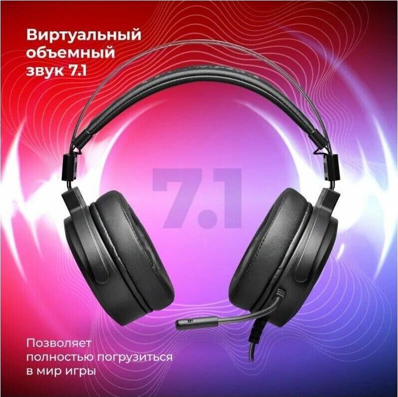 Виртуальный объемный звук 7.1 - Система обработки звука имитирует работу 7 колонок и сабвуфера, расположенных с разных сторон, создавая точную среду объемного звучания и позволяя полностью погрузиться в мир игры Подставка для наушников в комплекте Кнопка выключения микрофона - Просто отключите микрофон, если не хотите, чтобы собеседник или партнеры по игре вас слышали Светодиодная подсветка корпуса наушников - Идеально для киберспорта Регулятор громкости звука - Вам не придется переключаться на управление компьютером, чтобы отрегулировать уровень громкости Микрофон с шумоподавлением - Выведите коммуникацию с партнерами по игре на новый уровень Большие охватывающие амбушюры - Охватывающие амбушюры минимизируют давление на ушную раковину и обеспечивают дополнительную звукоизоляцию Наушники закрытого типа - Наушники не пропускают внешние шумы и обеспечивают максимальную звукоизоляцию. Это позволяет использовать их в шумных условиях, а также в тех случаях, когда необходимо полностью сосредоточиться на игре