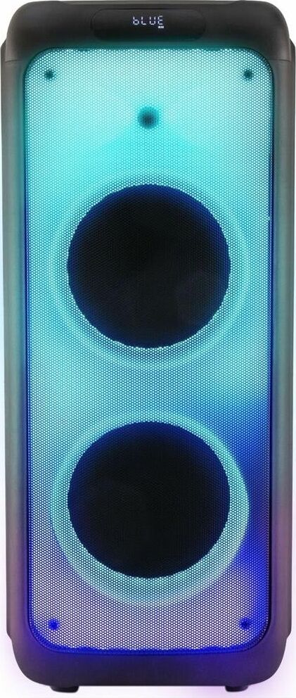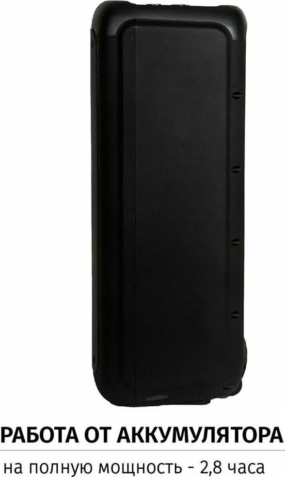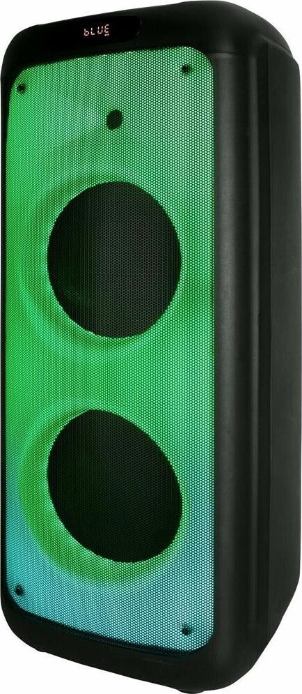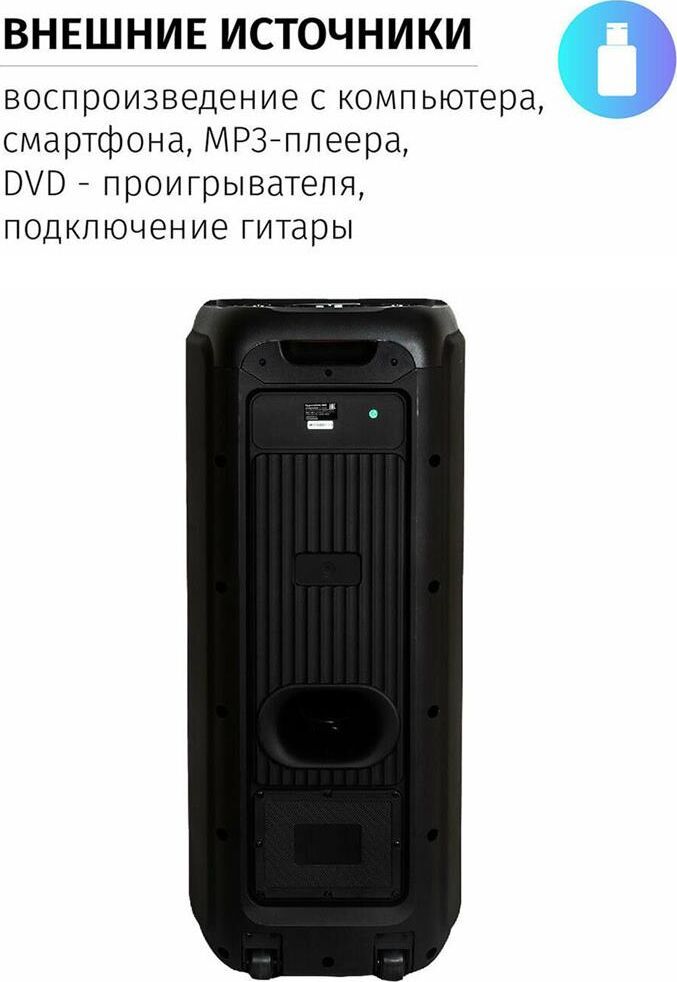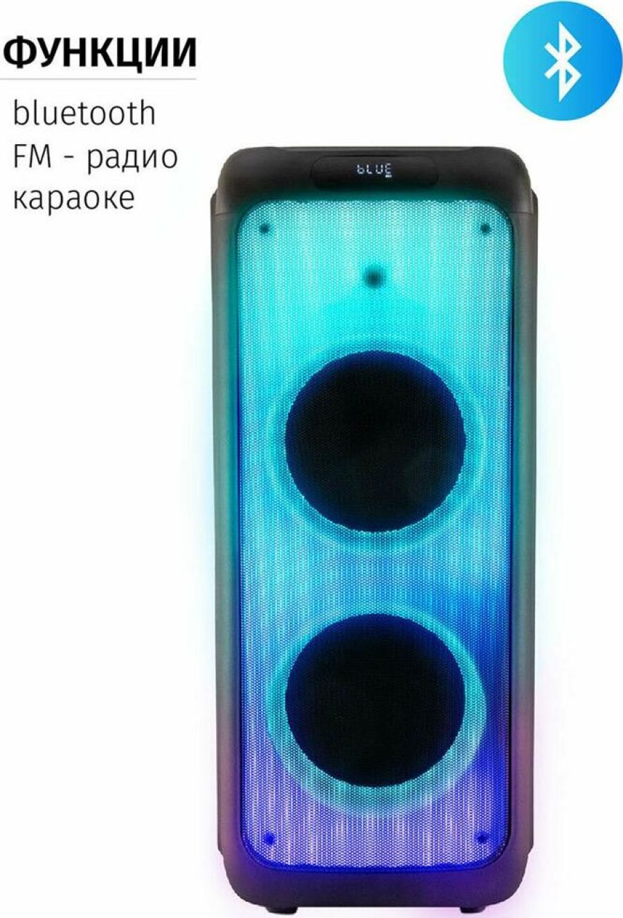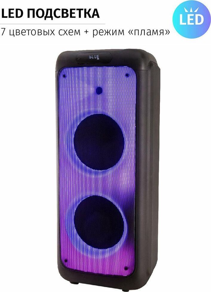 Акустическая система с Bluetooth, FM радио, и TWS. Выходная мощность (RMS), 100Вт, Частотный диапазон: 50Гц - 20кГц, Диапазон частот FM тюнера: 87.5 - 108 МГц, 7 цветовых схем подсветки, режим пламя, Размеры динамиков, низкочастотный динамик - 254мм x2, твитер -25мм, Беспроводная передача сигнала по Bluetooth, Воспроизведение музыки с носителей памяти - USB, TF card, Вход: для микрофона, USB, AUX, TF card, Функция Караоке, Функция регулировки эквалайзера, Функция TWS Встроенная аккумуляторная батарея 7000 мAч, Пульт управления, Размеры: 335*345*840мм Вес - 14КГ