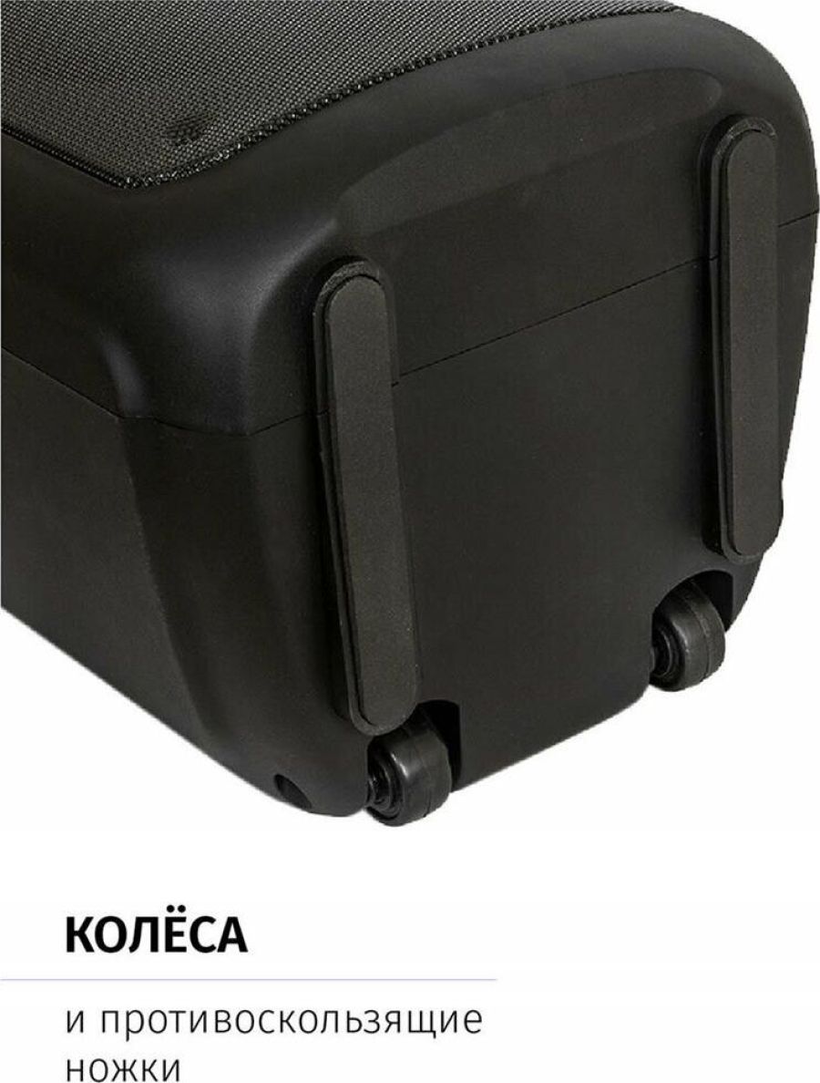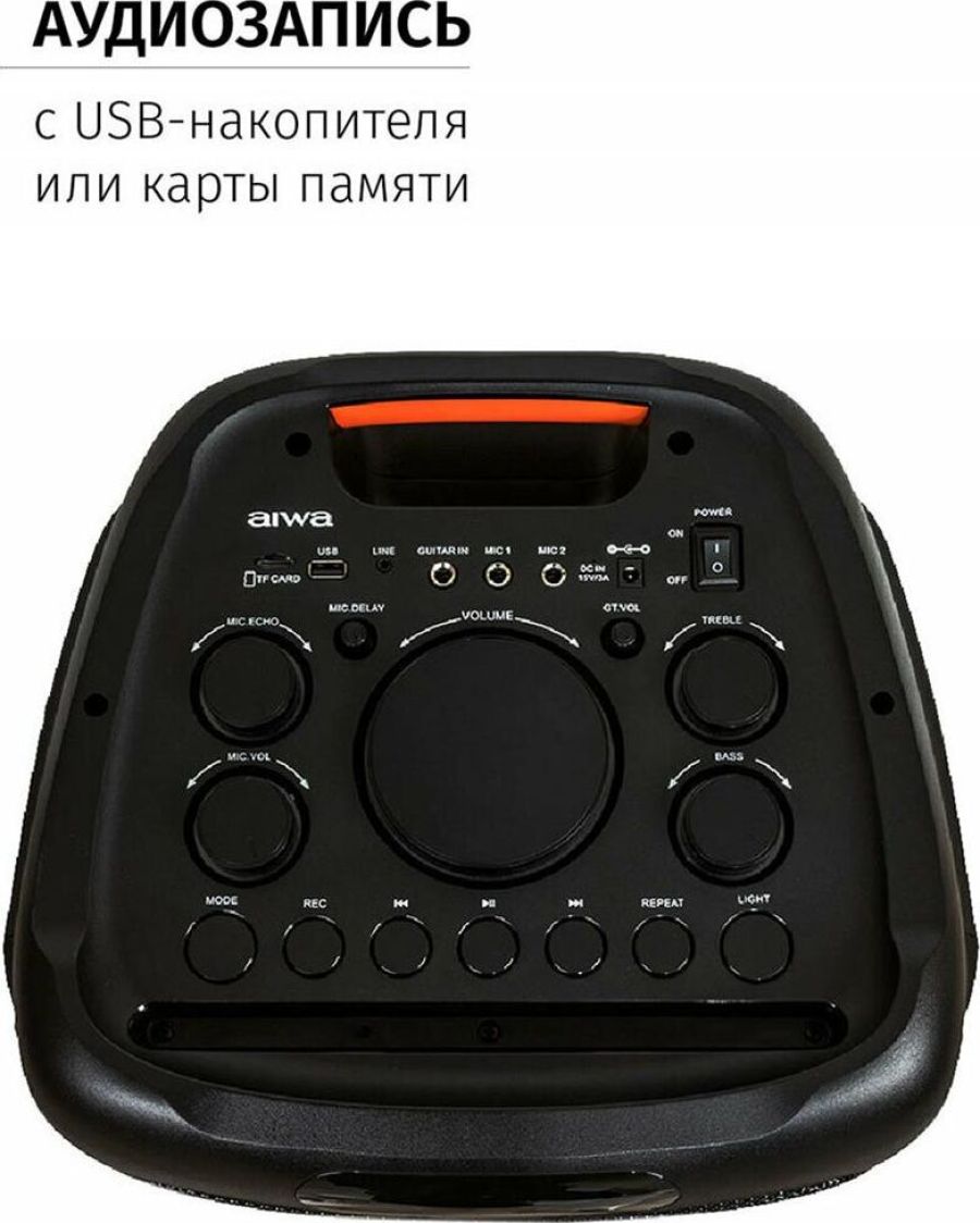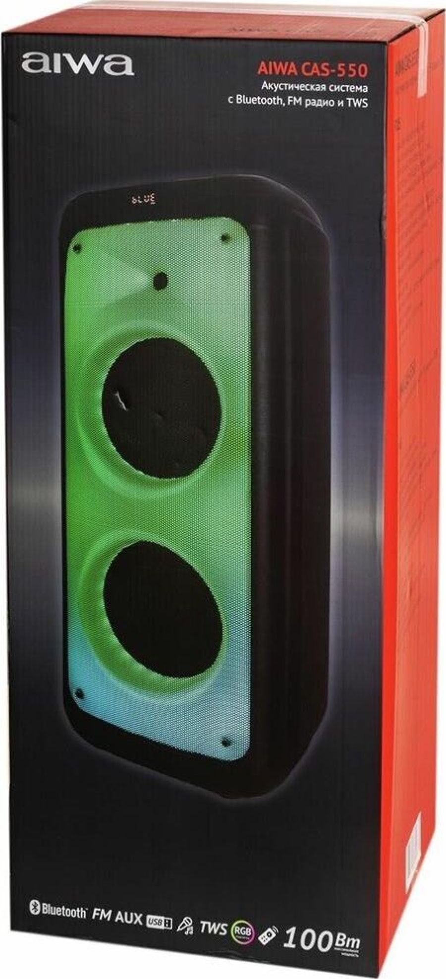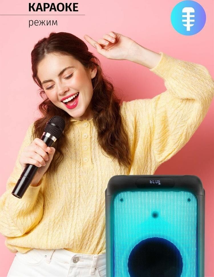 Акустическая система с Bluetooth, FM радио, и TWS. Выходная мощность (RMS), 100Вт, Частотный диапазон: 50Гц - 20кГц, Диапазон частот FM тюнера: 87.5 - 108 МГц, 7 цветовых схем подсветки, режим пламя, Размеры динамиков, низкочастотный динамик - 254мм x2, твитер -25мм, Беспроводная передача сигнала по Bluetooth, Воспроизведение музыки с носителей памяти - USB, TF card, Вход: для микрофона, USB, AUX, TF card, Функция Караоке, Функция регулировки эквалайзера, Функция TWS Встроенная аккумуляторная батарея 7000 мAч, Пульт управления, Размеры: 335*345*840мм Вес - 14КГ