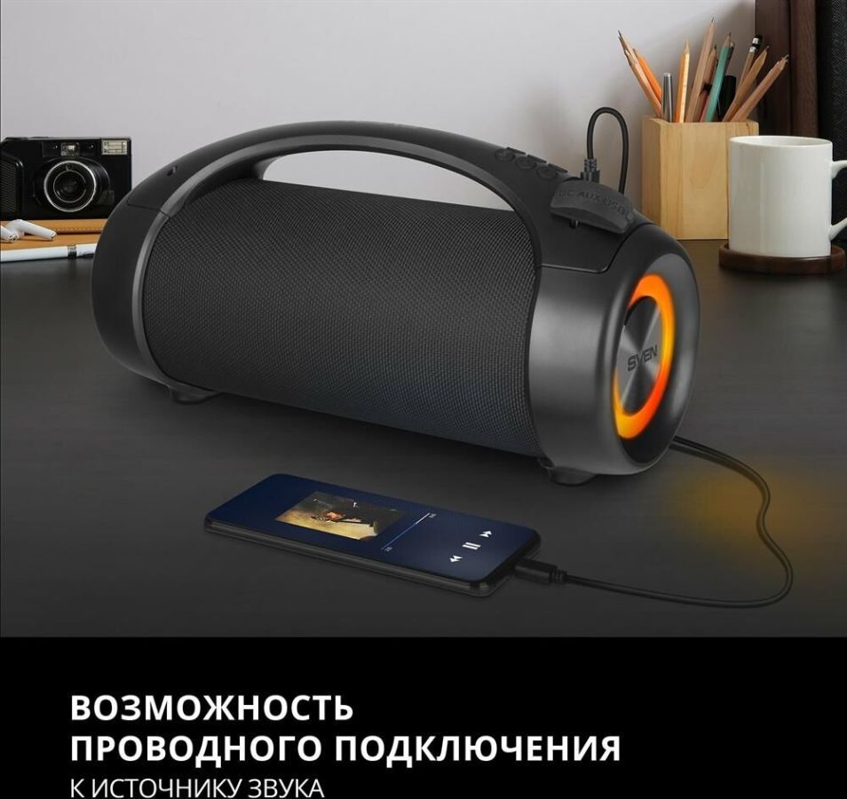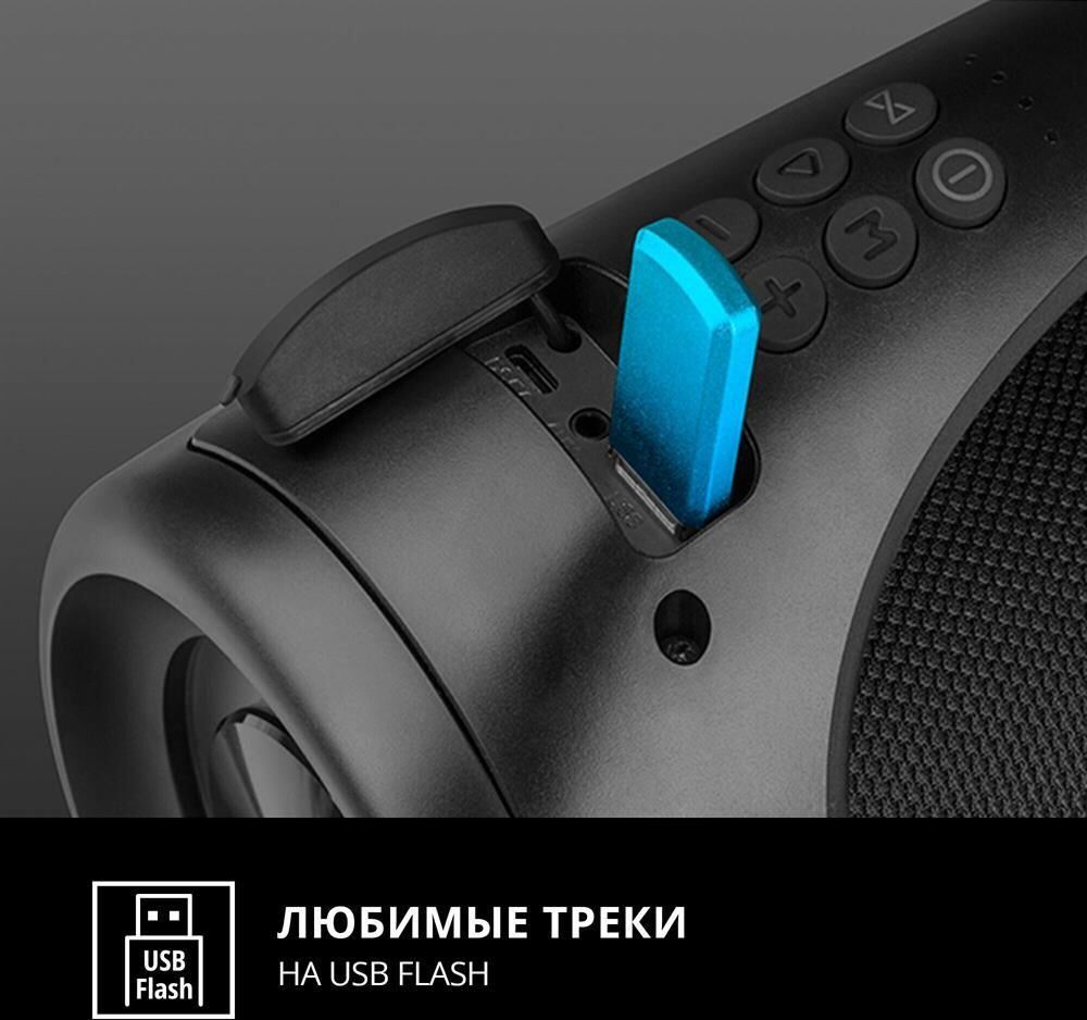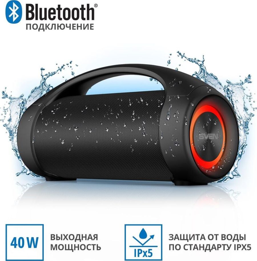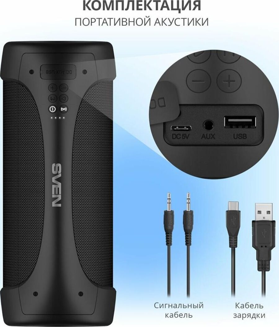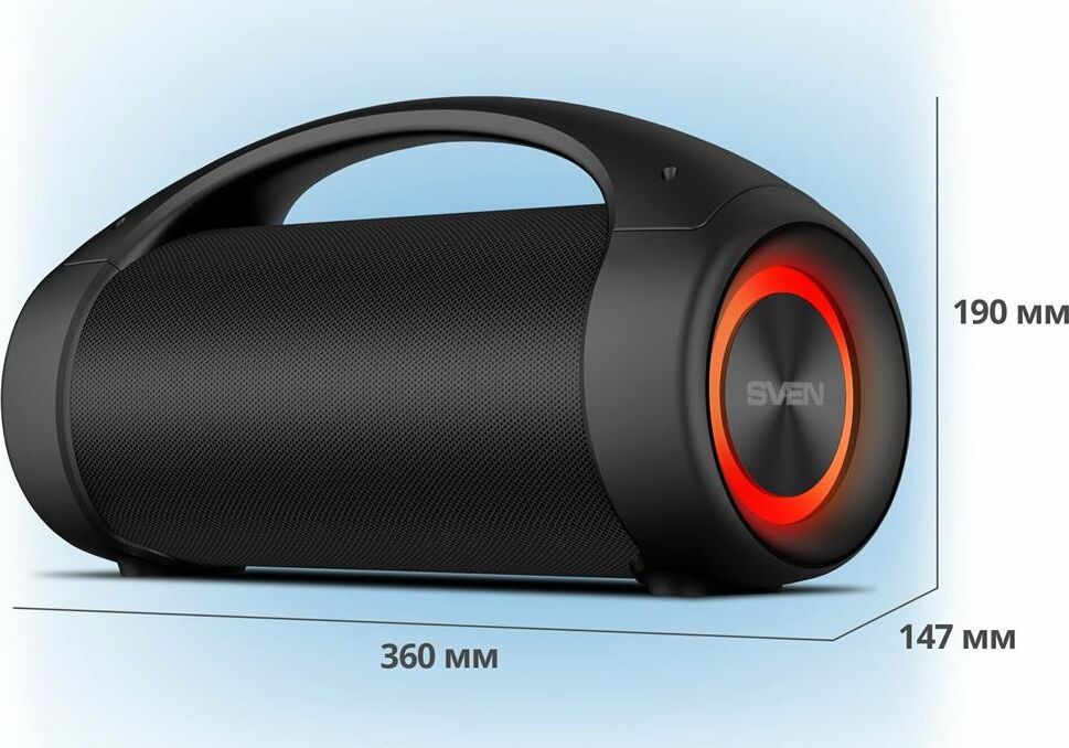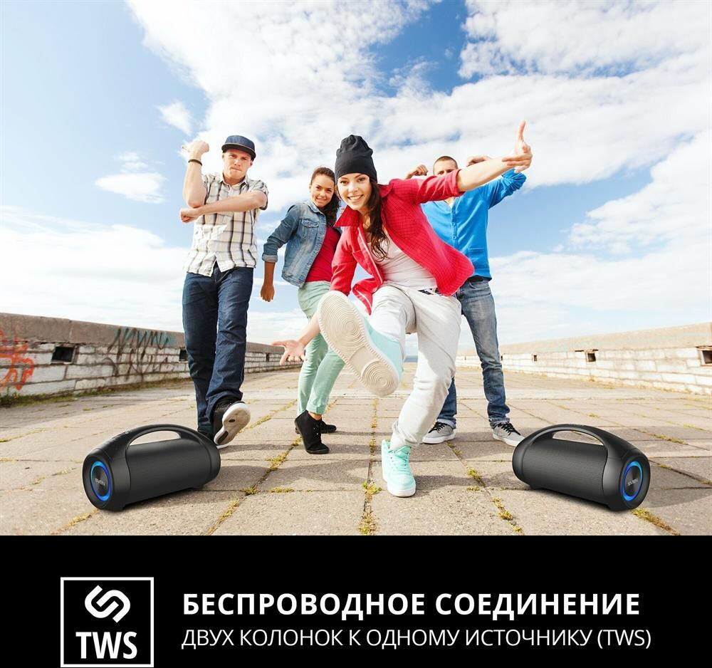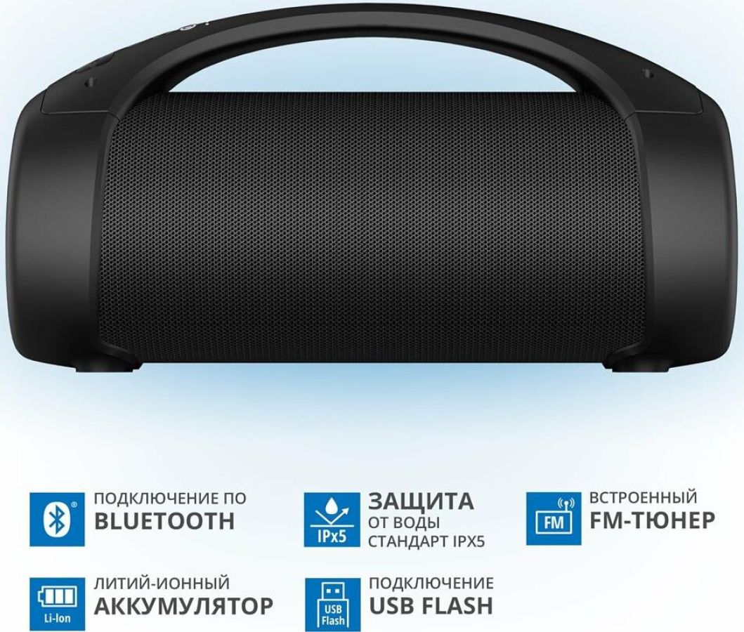 Выходная мощность (RMS), Вт 40 (2 ? 20) Частотный диапазон, Гц 70 – 20 000 Диапазон частот тюнера, МГц 87.5 – 108 Размеры динамиков, мм O 70 Беспроводная передача сигнала по Bluetooth да Воспроизведение музыки с носителей памяти USB Источник питания литий-ионный aккумулятор: 3600 мA · час (2 шт.) USB: DC 5 V Тип соединения Bluetooth, проводной Поддерживаемые профили Bluetooth HSP, HFP, A2DP, AVRCP Радиус действия, м до 10 Размеры изделия, мм 360 ? 147 ? 190 Вес, г 2500 Цвет черный