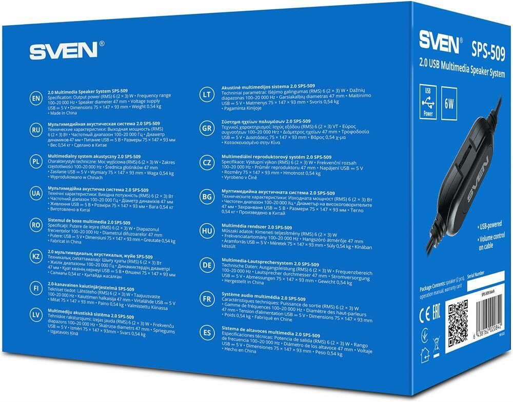 Срок службы: 1 г. , Гарантийный срок: и может отличаться в большую или меньшую сторону на момент покупки., актуальный срок гарантии указан в гарантийном талоне производителя, 1 г., приложенному к товару , Комплектация: черный, 6 Вт, питание USB (SV-020842), Колонки 2.0 Sven АС SPS-509