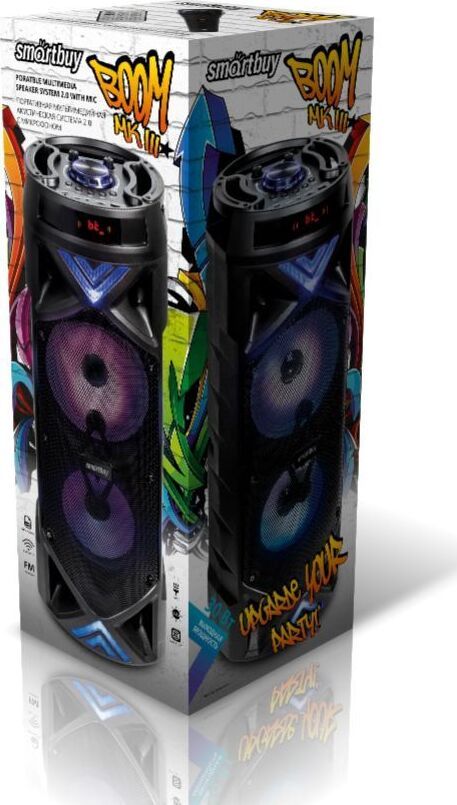 Тип: Портативная акустическая система. Максимальная выходная мощность (R.M.S.): 30 Вт. Диапазон воспроизводимых частот: 45 - 18000 Гц. Звук: стерео. Размер динамиков (мм): 165 мм. Питание: USB. Материал корпуса: Матовый пластик / Металл. Интерфейс соединения: Bluetooth / AUX 3,5мм/ FM / MP3. Телескопическая антенна. LED-экран. Подсветка. Пульт ДУ. Поддержка карт памяти microSD. Микрофон для караоке. Емкость аккумулятора: 3500 мАч. Время работы: 8 ч. Размер: 230*230*650 мм.