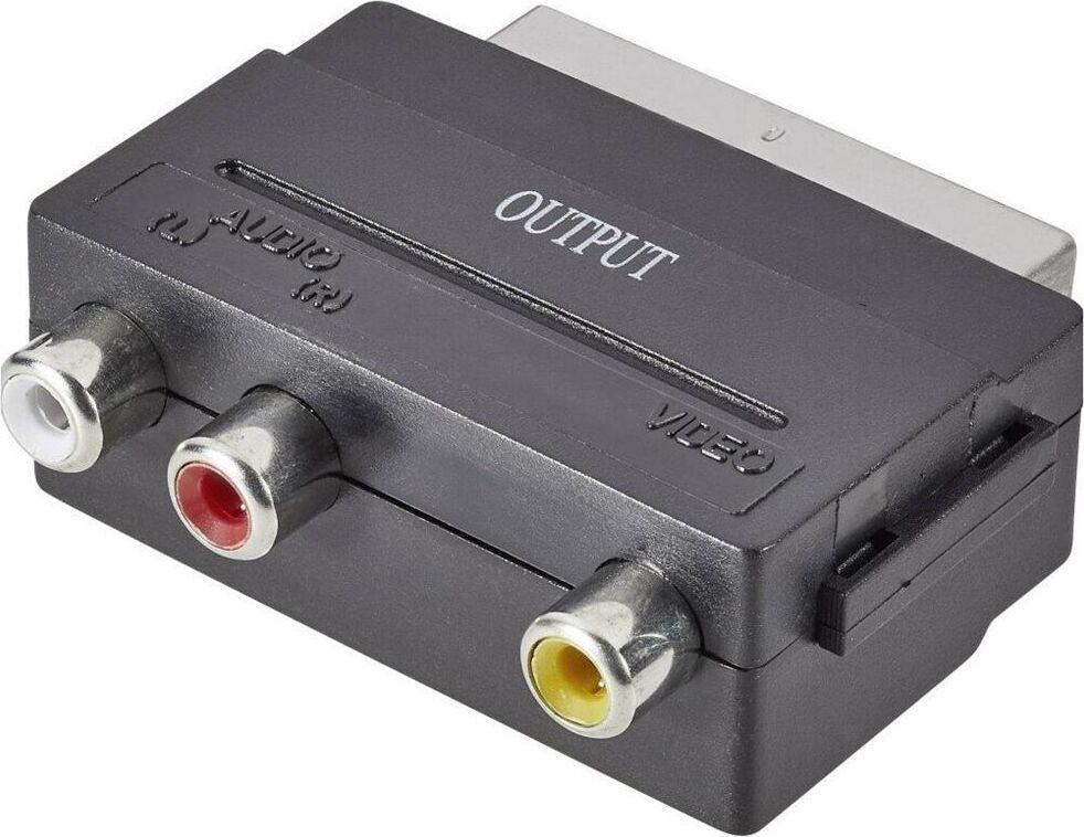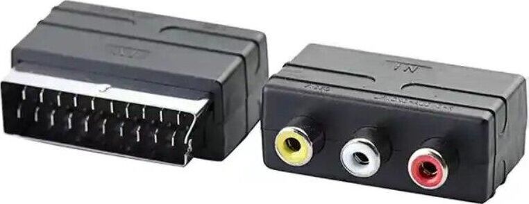 Переходник SCART (21 pin) вилка - 3xRCA розетка. Предназначен для передачи аналогового стереозвукового сигнала и композитного аналогового видеосигнала между аудио и аудио-видео устройствами или их компонентами. Переходник имеет направленность - разъем SCART подключается к приемнику сигналов.