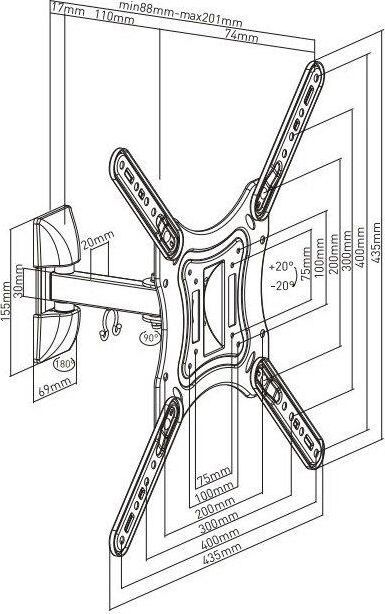 Диагональ экрана: 23"-55". VESA: 75x75, 100x100, 200x100, 200x200, 300x300, 400x200, 400x400. Максимальная нагрузка: 30 кг. Расстояние от стены: 88-201 мм. Угол поворота: +45°~-45°. Угол наклона: +20°~-20°. Материал: холоднокатаная сталь. Протестировано весом в 2 раза больше максимально допустимого. Конструкция свободного наклона. Направляющая для кабелей.