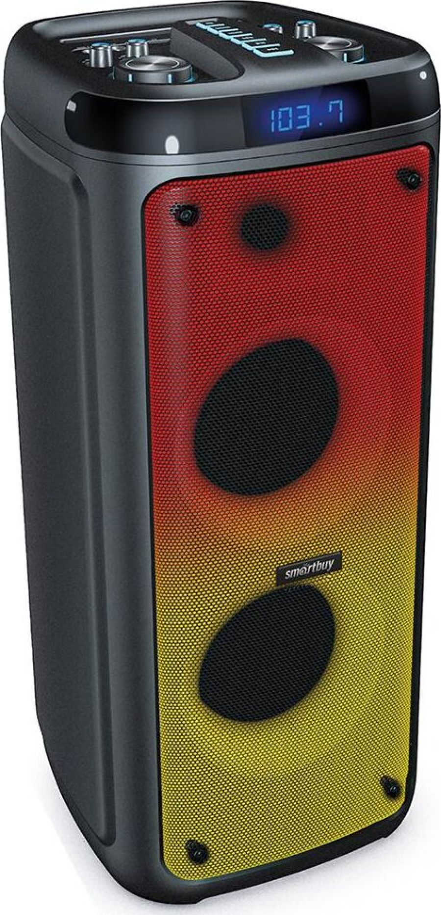 Архитектура: 2.0; Макс.выходная мощность: 60 Вт; Мощность каналов: 2 x 30 Вт; Интерфейс соединения: Bluetooth 5.0 / MP3 (USB)/AUX; Размер динамиков: 2 x 203 мм; Диапазон воспроизводимых частот широкополосных динамиков: 20 Гц - 17 кГц; Диапазон воспроизводимых частот сабвуфера: ; Питание: 220В / 5000 мАч / 7,4В; Материал корпуса: пластик, металл; Управление: 1. Уровень громкости / Включение 2. Управление подсветкой 3. Переключение режимов 4. Переключение треков / радиостанций 5. Пульт ДУ