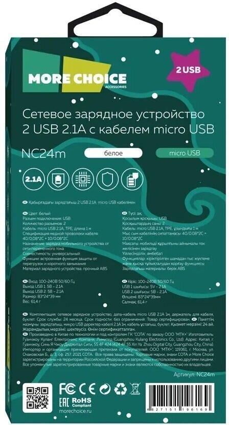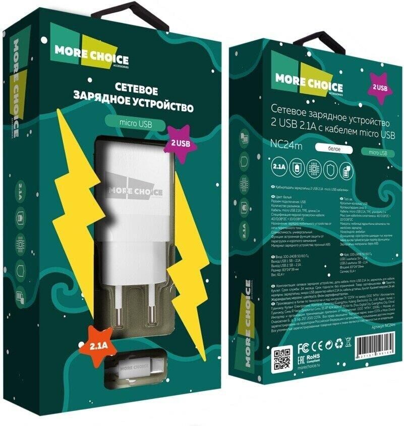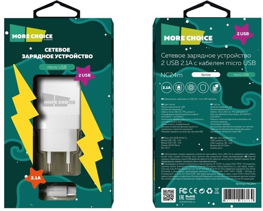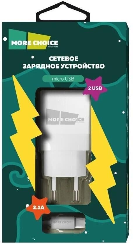 Сетевой адаптер с двумя USB-выходами и кабелем microUSB для зарядки смартфонов и прочих мобильных устройств. Сила тока - 2.1 А. Корпус сделан из термоэластопласта, коннектор - из поливинилхлорида. Представлен в белом и черном цветах. В комплекте - СЗУ, кабель microUSB, держатель для кабеля, буклет