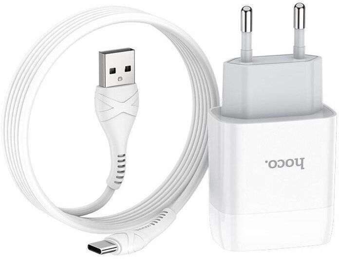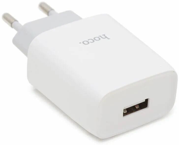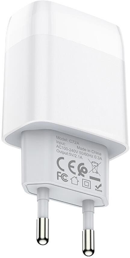 Сетевое зарядное устройство Hoco C72A с одним выходом USB-A и кабелем USB-type-C в комплекте. Поддерживает силу тока до 2.1 А. Корпус изготовлен из огнеупорного пластика. Размеры СЗУ: 82 х 42 х 26 мм. Вес адаптера 33 г, вес адаптера с кабелем 55 г.