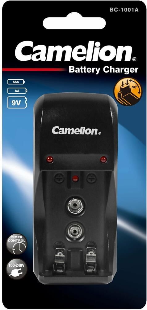 CAMELION BC-1001A TITANIUM (BC-1001A, ЗУ для 2хAA, AAA или 1X9V, 200мА, складная вилка, таймер ) Зарядное устройство Camelion BC-1001A для 1-2 шт аккумуляторов АА/ААА или 1 шт Крона 9В. Складная вилка, таймер и индикатор заряда. Ток заряда - 200 мА, питание от сети 100-240 В. Защита от короткого замыкания и неправильной установки. Срок службы 5 лет. Гарантийный период 1 год.