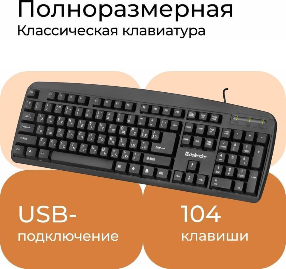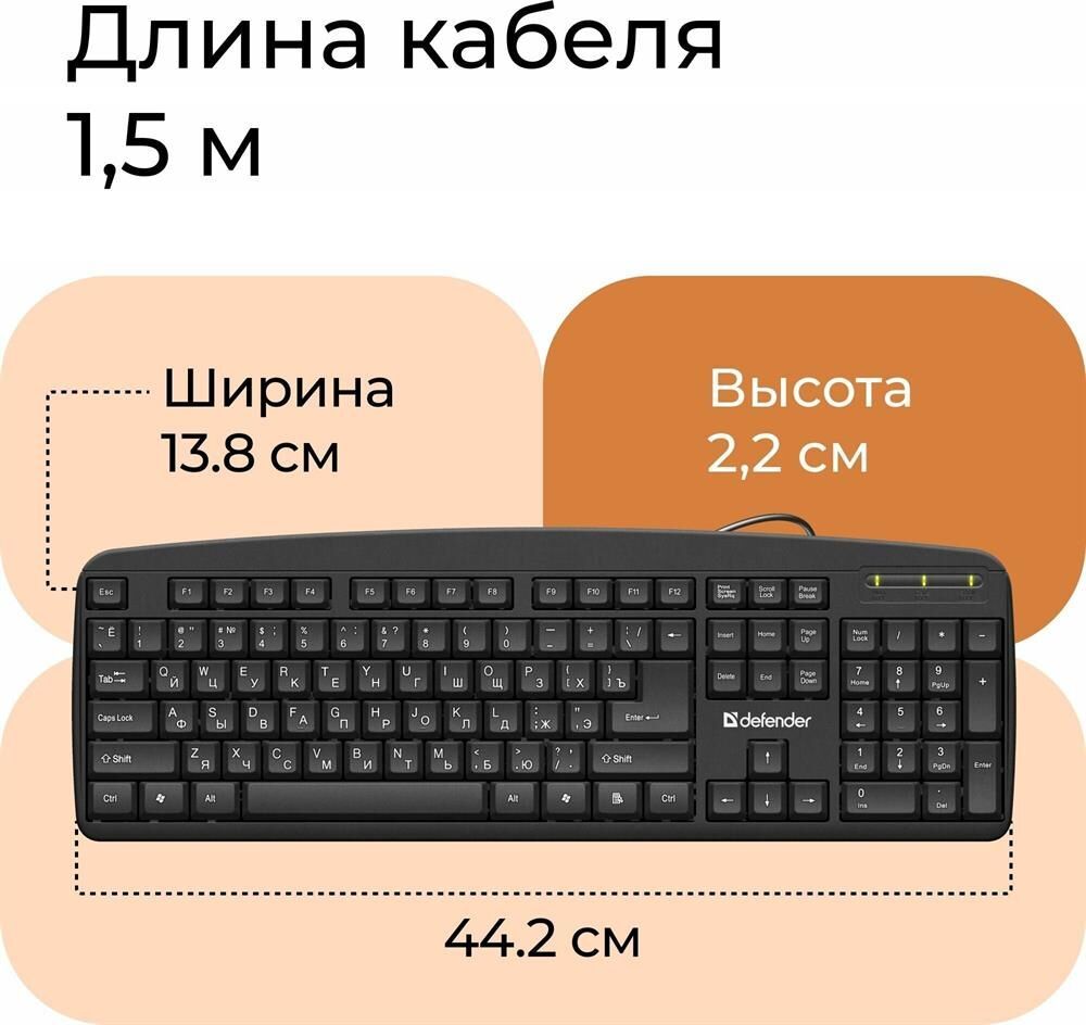 Интерфейс подключения: USB, Количество нажатий: 5 миллионов, Длина кабеля: 1,5+5% м, Тип клавиатуры Мембранная, Кол-во клавиш: 104 шт, Системные требования для ПК: Windows 2000/XP/Vista/7/8/10, Mac OS X10.