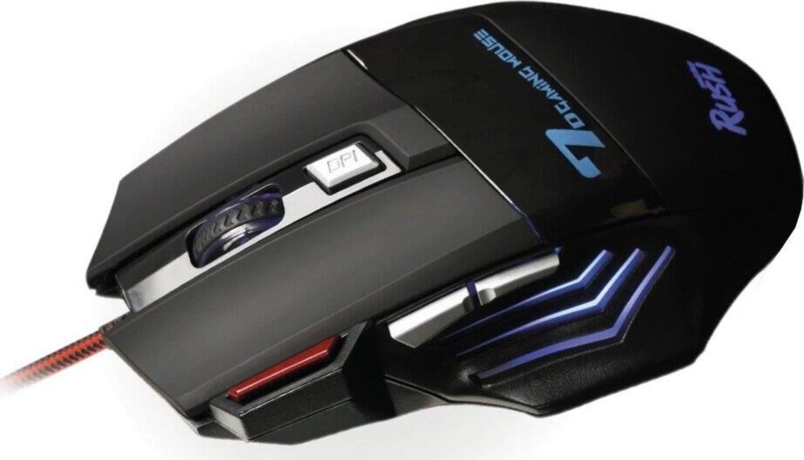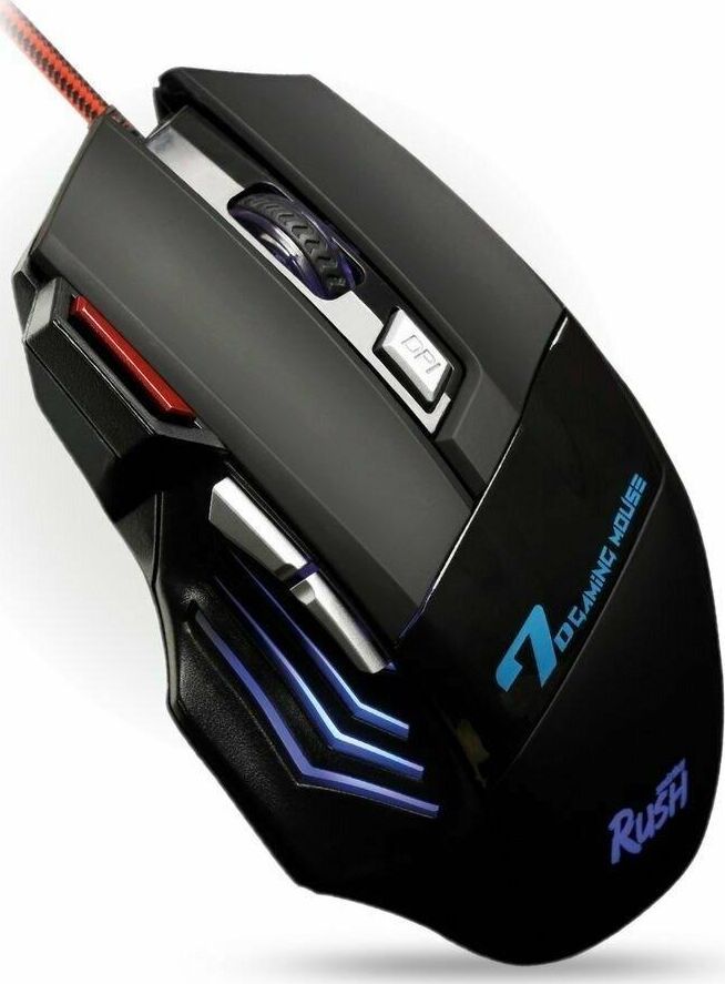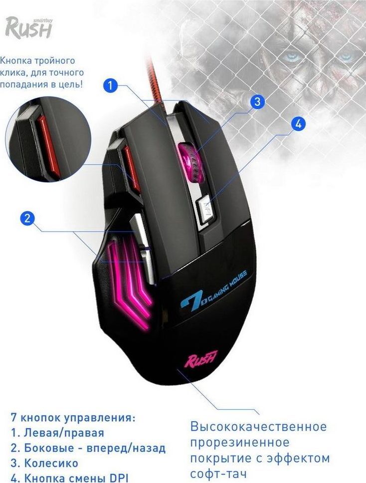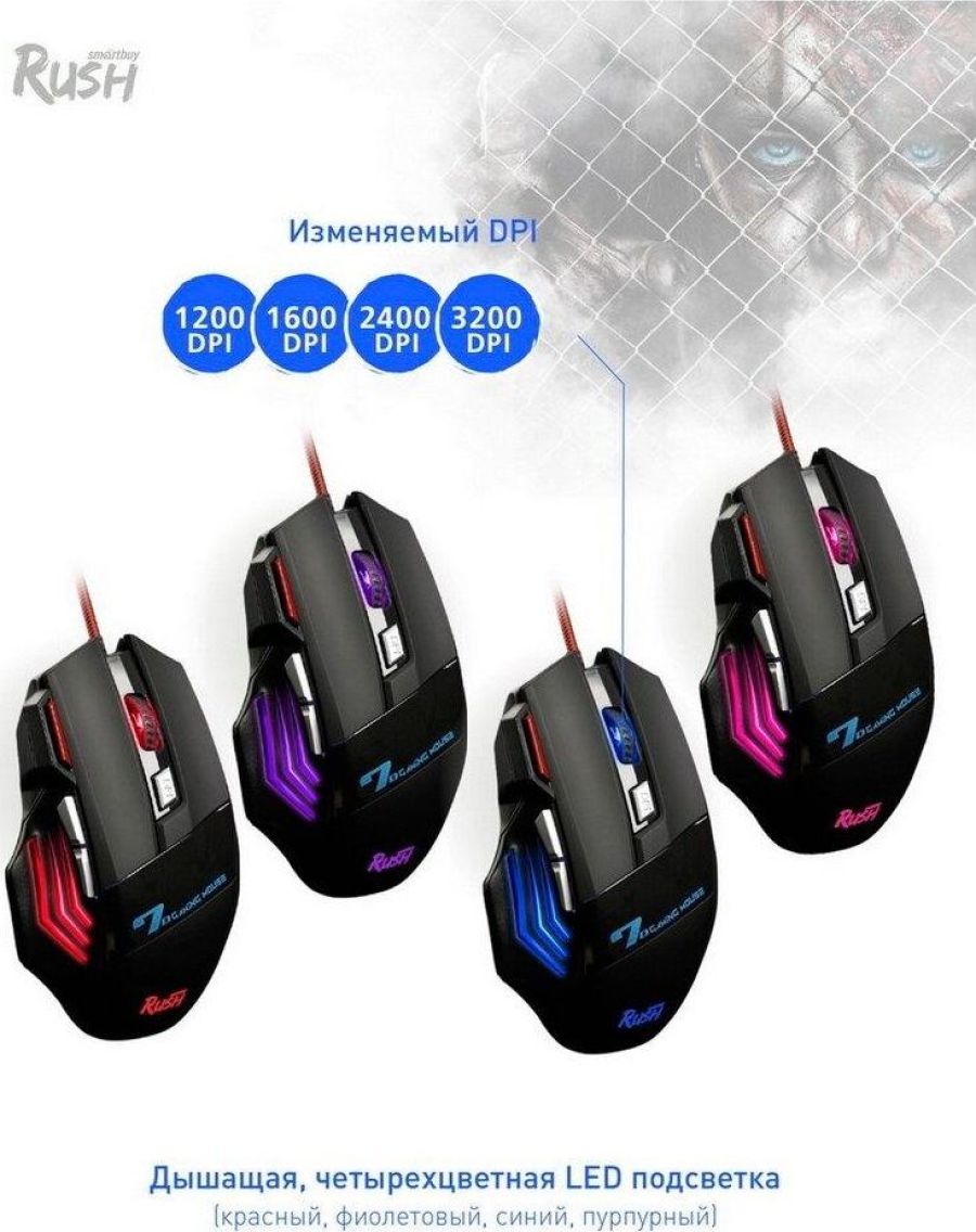 Мышь игровая, проводная, интерфейс USB, количество кнопок - 7 , изменяеоме разрешение 1200/1600/2400/3200 dpi, 4-х цветная LED-подсветка, металлическая пластина внутри корпуса мыши, кабель в текстильной оплетке с ферритовым фильтром, высококачественное покрытие софт-тач, длина кабеля - 1,5 м.