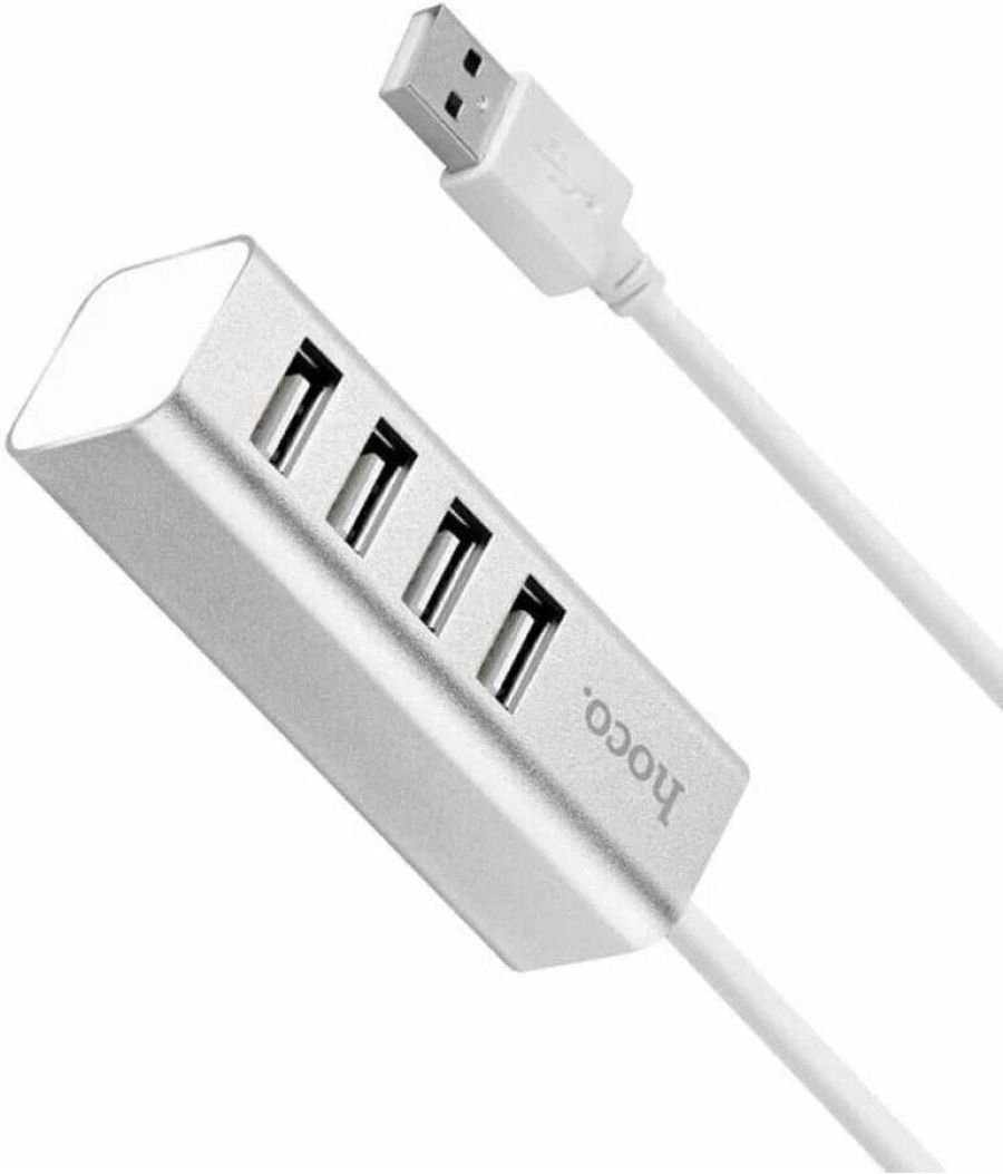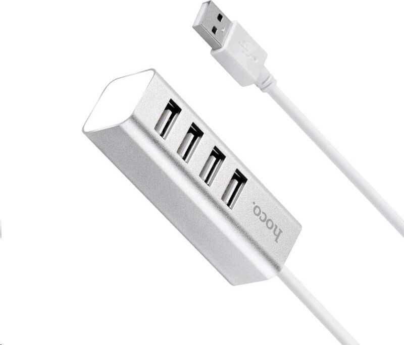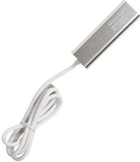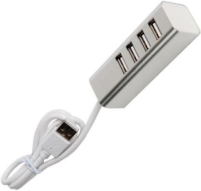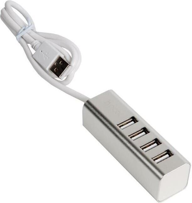 USB Хаб-концентратор. Позволяет передавать данные и заряжать устройства через свои USB-порты. Материал - пластик. Разъёмы - 4хUSB. Входное напряжение - 5В. Длина кабеля - 80см. Цвет - серебристый.