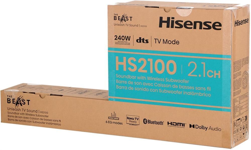 2.1-канальная звуковая панель Hisense HS2100 оснащена беспроводным 5,25-дюймовым сабвуфером и является идеальным дополнением к вашей домашней развлекательной системе. Благодаря DTS Virtual:X HS2100 обеспечивает мощный и захватывающий объемный звук в любой комнате. Благодаря выходу HDMI OUT (ARC) саундбар Hisense HS2100 легко установить и подключить к телевизору по беспроводной сети через Bluetooth или с помощью одного кабеля HDMI.