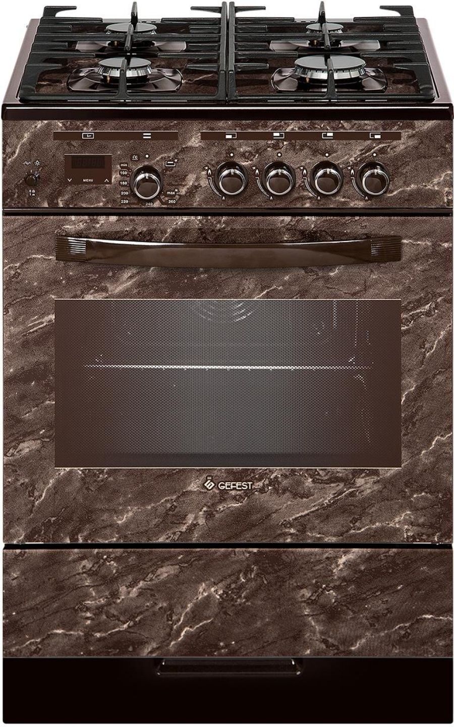 Газовая плита. Цвет: коричневый с рисунком "мрамор". Варочная поверхность стеклянная. Габаритные размеры ШхГхВ: 60х60х85см. Полезный объём духовки: 52 л. Фасад стеклянный. Варочная поверхность стеклянная. Без крышки. Вертел с электроприводом. Выдвижной ящик для посуды и принадлежностей. Газ-контроль горелок стола. Газ-контроль духовки. Гриль. Ножки регулировочные. Подсветка духовки двойная. Съемные проволочные направляющие духовки. Таймер сенсорный. Терморегулятор (термостат). Чугунные решетки горелок стола. Электророзжиг горелок, встроенный в ручки. Электророзжиг духовки, встроенный в ручку.