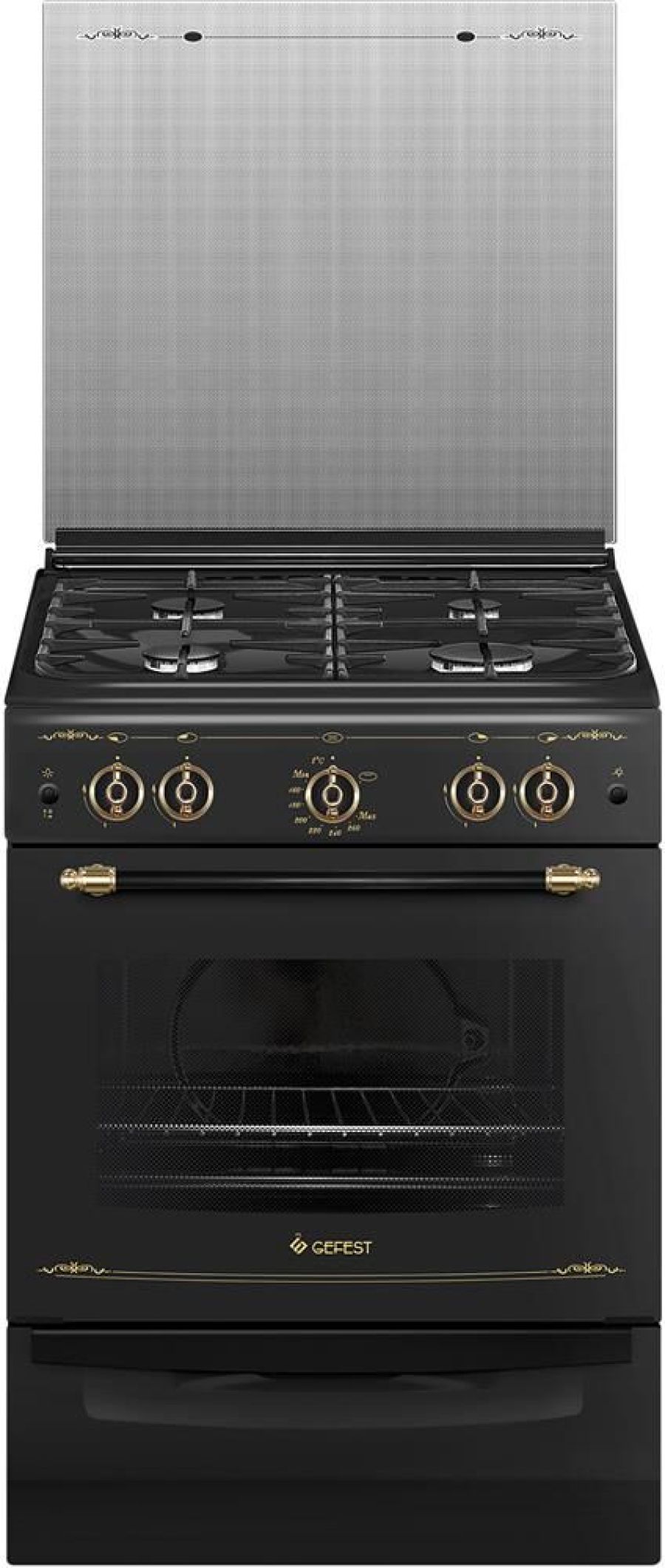 Габаритные размеры ШхГхВ: 60х60х85 см * Полезный объём духовки: 52 л * Цвет: черный. Варочная поверхность: эмалированная. * Выдвижной ящик для посуды и принадлежностей * Съемные проволочные направляющие духовки * Газ-контроль духовки * Терморегулятор (термостат) * Гриль * Ножки регулировочные * Электророзжиг горелок, кнопка розжига на панели * Подсветка духовки одинарная * Электророзжиг духовки, кнопка розжига на панели