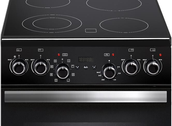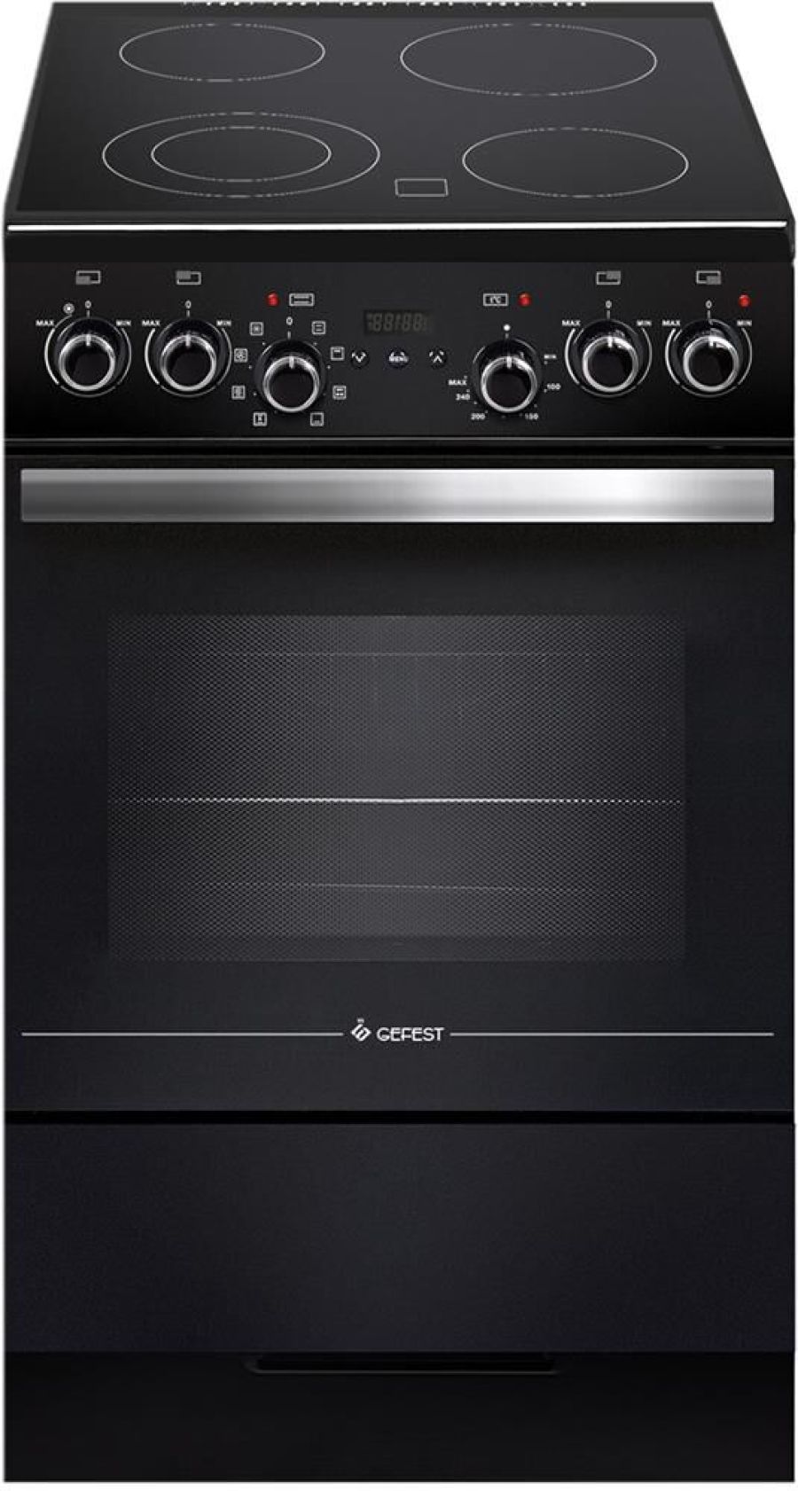 Габариты, ШхГхВ, см: 50x58.5x85; Цвет: черный; Дизайн: классический; Ширина, см: 50; Фасад: закаленное стекло; Варочная поверхность: стеклокерамическая; Количество зон приготовления: 4; Класс энергоэффективности: А; Диапазон номинальных напряжений, В: 220-230; Номинальная потребляемая мощность электроэнергии, кВт: 6,81-7,45; Объем духовки, л: 55; Конвекция; Мощность верхнего ТЭН духовки, кВт: 0,8; Мощность нижнего ТЭН духовки, кВт: 1,2; Мощность ТЭН вентилятора, кВт: 2,0; ТЭН-гриль: 1,2; Управление: механическое; Блокировка управления; Таймер: сенсорный, многофункциональный; Двухзонные конфорки; Гриль: электрический; Вертел с электроприводом; Шашлычница; Ускоренный гриль с ковекцией; Подсветка духовки: одинарная; Направляющие духовки: съемные проволочные; Терморегулятор; Ящик для посуды и принадлежностей: выдвижной ящик; Ножки регулировочные; Сетевой шнур и вилка: в наличии