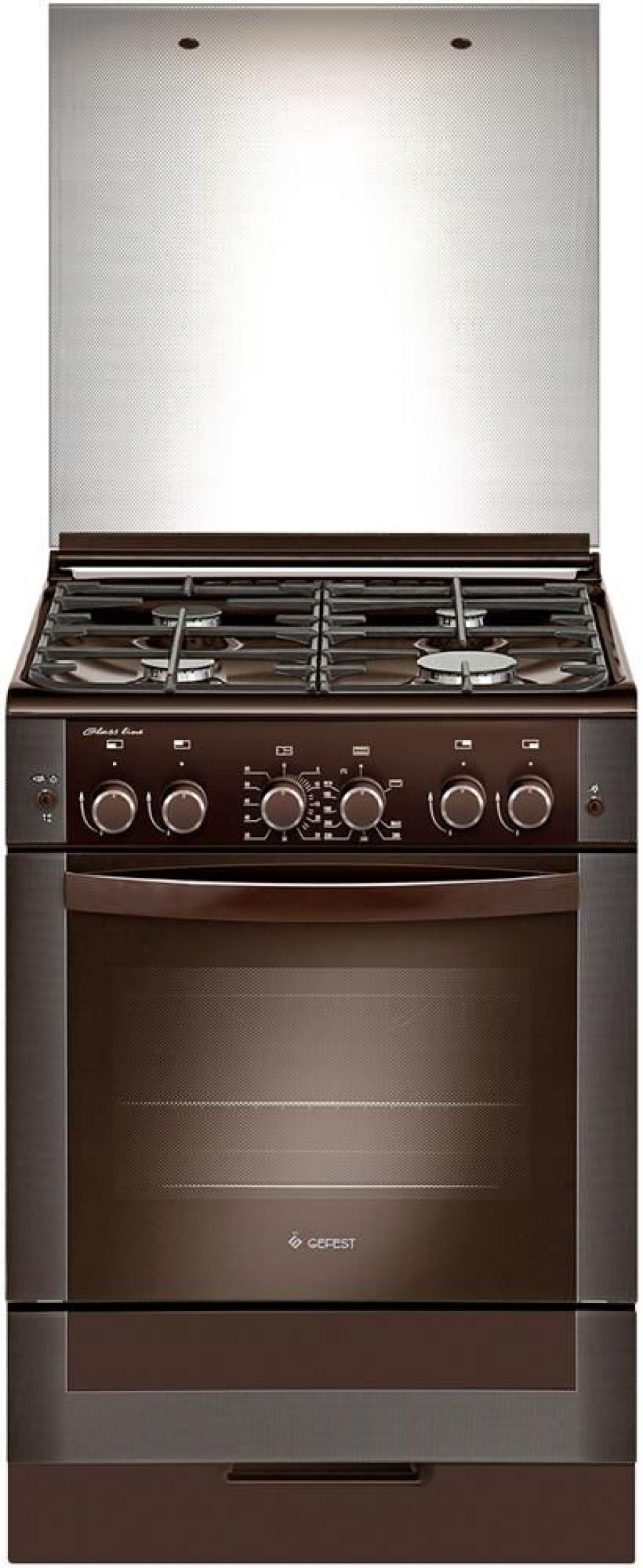 Габариты, ШхГхВ, см: 60x60x85; Цвет: коричневый; Дизайн: классик; Ширина, см: 60; Фасад: закаленное стекло; Варочная поверхность: эмалированная; Решетки стола: чугунные; Крышка стола: стеклянная; Класс электробезопасности: I; Объем духовки, л: 52; Мощность горелки духовки, кВт: 3,1; Мощность гриль-горелки, кВт: 1,9; Таймер: механический; Газ-контроль духовки; Электророзжиг духовки: кнопка на панели; Электророзжиг горелок стола: кнопка на панели; Гриль: газовый; Вертел с электроприводом; Подсветка духовки; Направляющие духовки: съемные проволочные; Терморегулятор (термостат); Ящик для посуды и принадлежностей: выдвижной; Ножки регулировочные; Сетевой шнур и вилка: в наличии; Стекло дверцы духовки: двойное; Комплектность: жаровня, противень, решетка духовки; Комплект: Сменных сопел