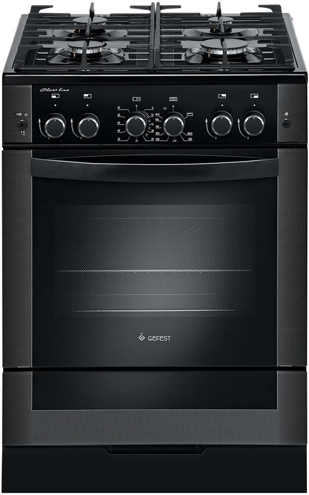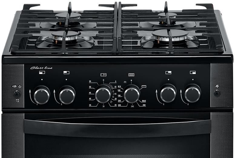 Габариты, ШхГхВ, см: 60x60x85; Цвет: черный; Дизайн: классик; Ширина, см: 60; Фасад: закаленное стекло; Варочная поверхность: закаленное стекло; Решетки стола: чугунные; Класс электробезопасности: I; Объем духовки, л: 52; Мощность горелки духовки, кВт: 3,1; Мощность гриль-горелки, кВт: 1,9; Таймер: механический; Газ-контроль духовки; Электророзжиг духовки: кнопка на панели; Электророзжиг горелок стола: кнопка на панели; Гриль: газовый; Вертел с электроприводом; Подсветка духовки: Направляющие духовки: съемные проволочные; Терморегулятор (термостат); Ящик для посуды и принадлежностей: выдвижной; Ножки регулировочные; Сетевой шнур и вилка: в наличии; Стекло дверцы духовки: двойное; Комплектность: жаровня, накладка для посуды малого диаметра, противень, решетка духовки; Комплект сменных сопел