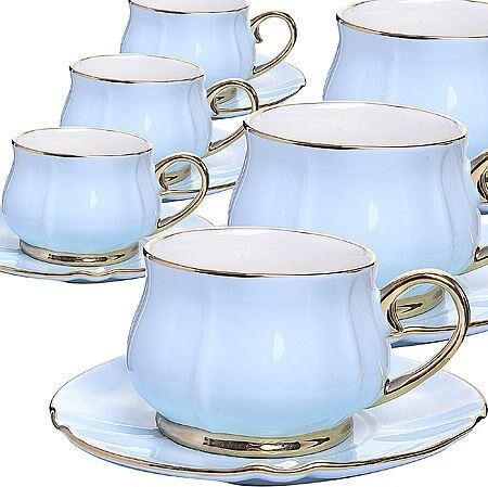 Чайный набор 12 пр LR (х6). Материал: костяной фарфор. Цвет: бледно-голубой, золотой. D чашки 7,7 см, высота 6,5 см. Объем чашки: 200 мл. Диаметр блюдца: 15 см. Размер упаковки: 40 х 25,5 х 9,5 см. Упаковка: подарочная коробка. Вес: 2,4 кг. Страна производитель: Китай.