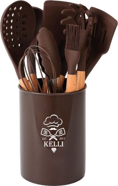 Набор кухонных принадлежностей 12 предметов: Лопатка для жарки; Кисточка; Щипцы; Лопатка кондитерская; Половник; Шумовка; Лопатка с отверстиями; Ложка для салатов; Венчик; Ложка; Ложка для спагетти; Состав: бамбук и силикон