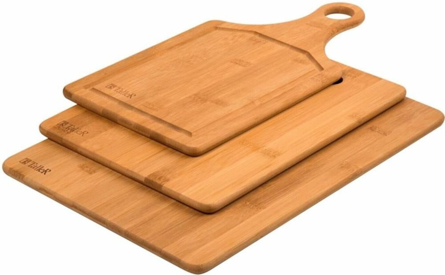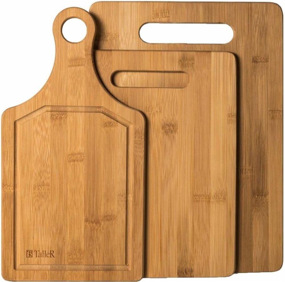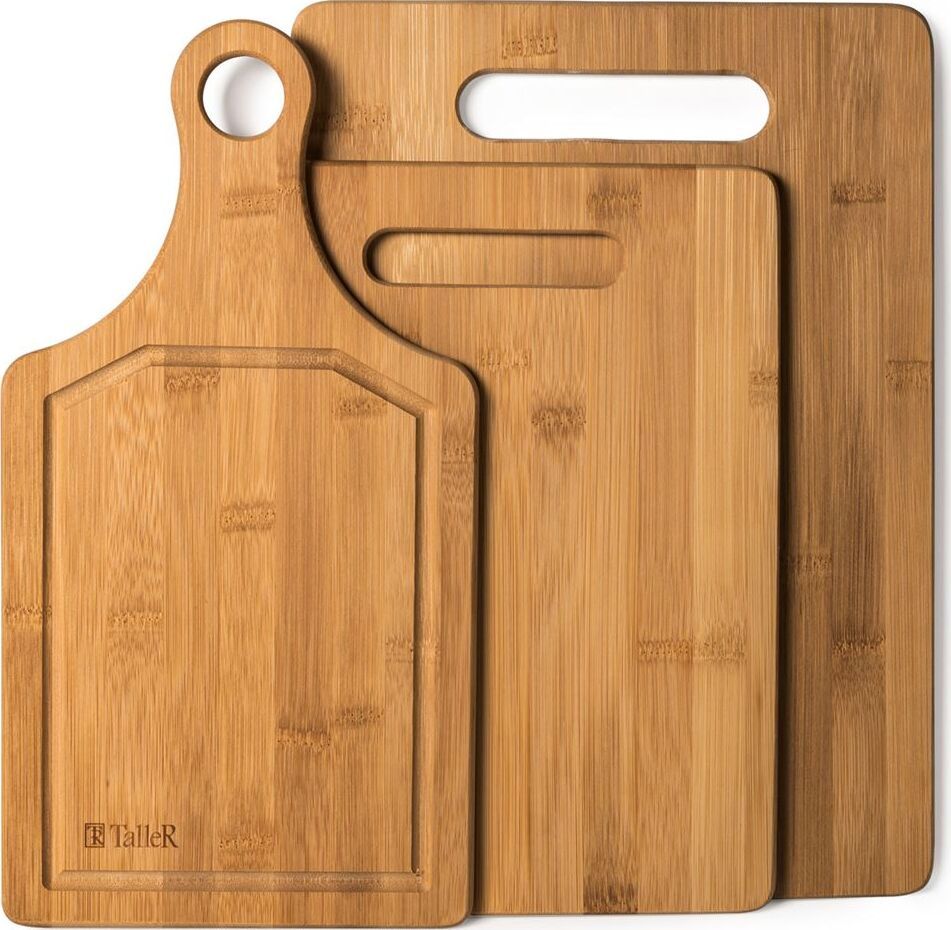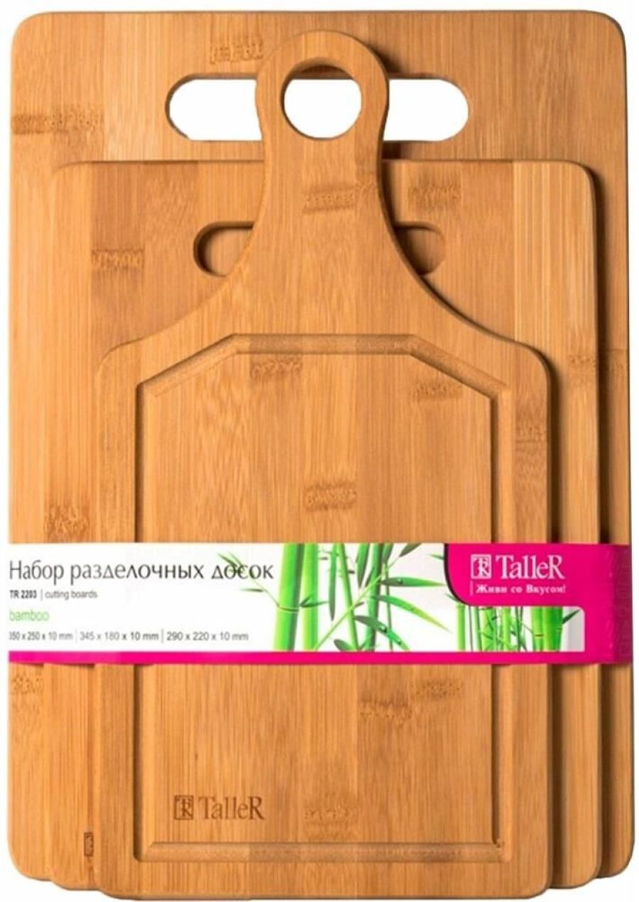 Набор разделочных досок Описание: набор разделочных досок: большая — 35*25*1 см, средняя — 34,5*18*1 см, маленькая — 29*22*1 см Материал: бамбук Рекомендуется мыть вручную