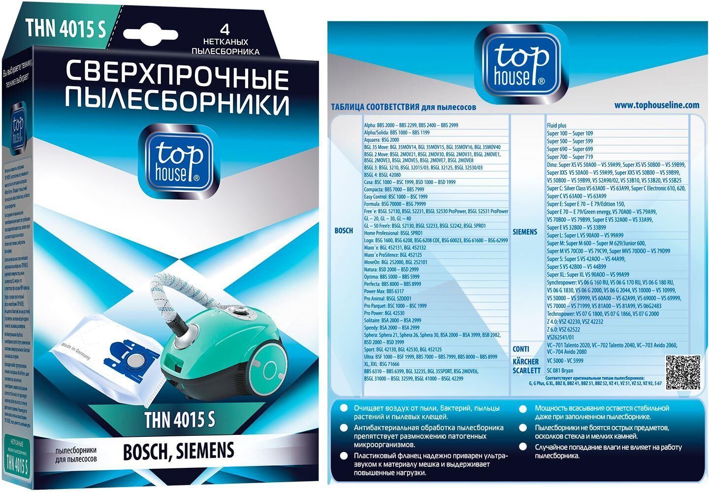 TOP HOUSE THN 4015 S Сверхпрочные нетканые пылесборники с антибактериальной обработкой, 4 шт. для пылесосов BOSCH: Alpha, Alpha/Solida, Aquaera, BGL 35 Move, BSGL 2 Move, BSGL 3, BSGL 4, Casa, Compacta, Easy Control, Formula, Free'e, GL-20, GL-30, GL-40, GL-50, Home Professional, Logo, Maxx'x, Maxx'x ProSilence, Natura, Optima, Perfecta, Power Max, Pro Animal, Pro Parquet, Pro Power, Solitaire, Speedy, Sphera, Sport, Ultra и тд. SIEMENS: Fluid plus, Dino, Super, Super C, Super E, Super L, Super M, Super S, Super XL, Synchropower, Technopower. Соответствуют оригинальным типам пылесборников: G, G Plus, G XL, BBZ 8, BBZ 41, BBZ 51, BBZ 52, VZ 41, VZ 51, VZ 52, VZ 92, S 67. Изготовлены из многослойного нетканого материала Micro-Fleece на одном из лучших заводов в Германии - Aichner-Filter GmbH. Обеспечивают уровень фильтрации воздуха в 99,98%.