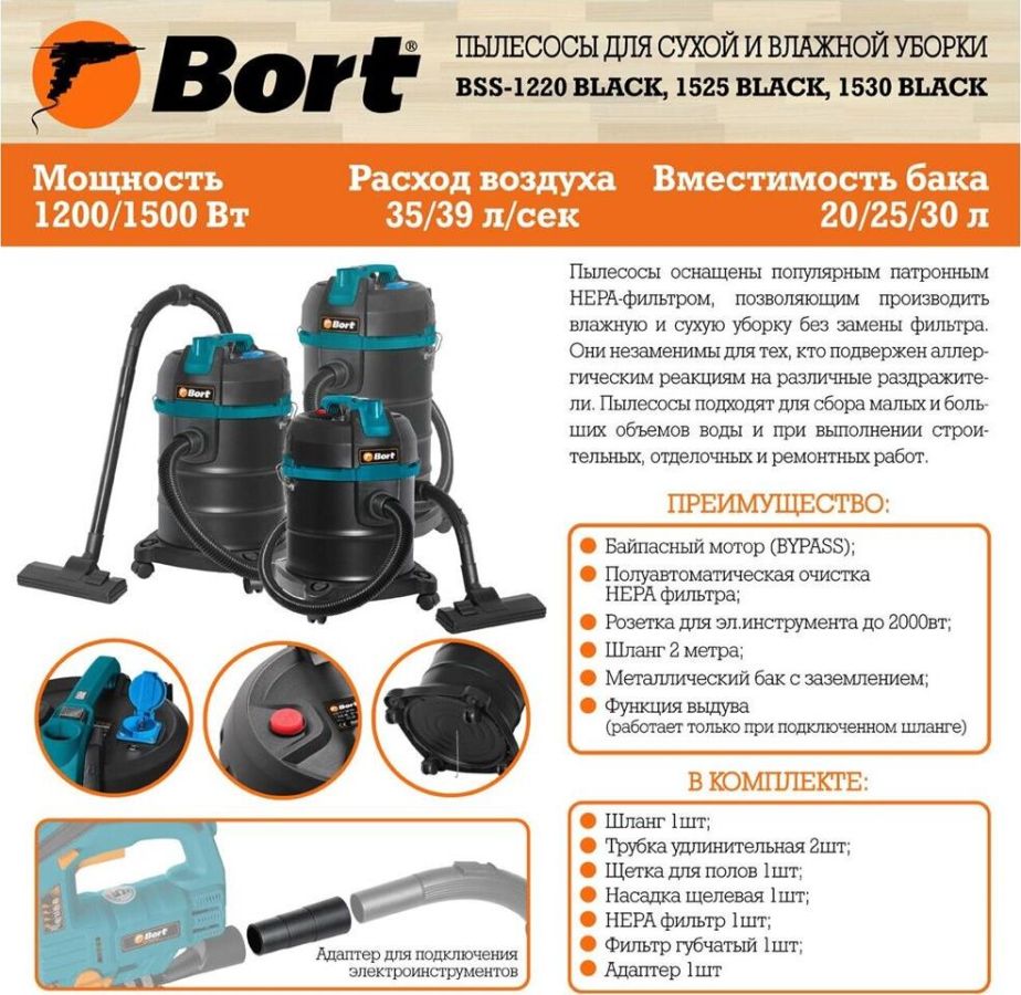 Расход воздуха, л/сек39.Функция выдува Да.Расход воздуха на крыльчатке, л/сек74. Длина кабеля, м6.Вместимость пылесборника, л25.Уровень шума, дБ80.Потребляемая мощность, Вт1 500.Функция распыления моющего раствора Нет.Разрежение, кПа21.Вес изделия, кг6,3.Тип пылесоса Мультифункциональный пылесос.Напряжение, В220.Технология мультициклон Нет.Частота тока, Гц50.Тип уборки Сухая и влажная уборка.Мощность розетки для подключения, Вт0...1 000.Длина шланга, м2.Регулировка силы всасывания на рукоятке Нет.Диаметр шланга, мм32.Сливное отверстие Нет.Мощность всасывания, Вт300.Вес брутто, кг7,02.Тип фильтрации Патронный HEPA фильтр.Габариты упаковки, см37,5 x 37,5 x 59. Функция сбора жидкости Да.