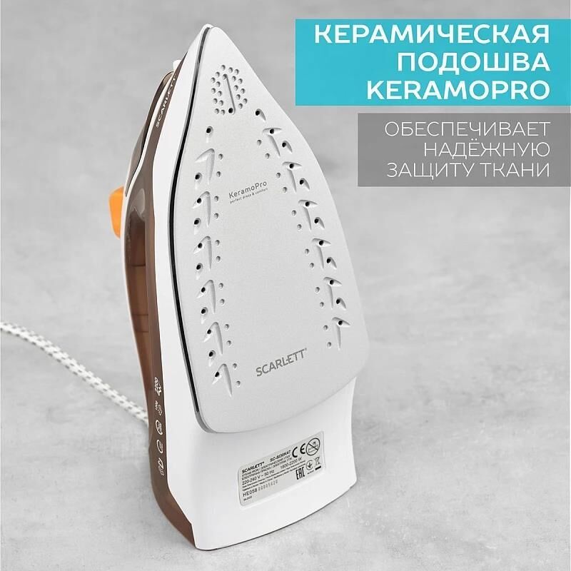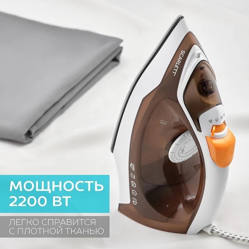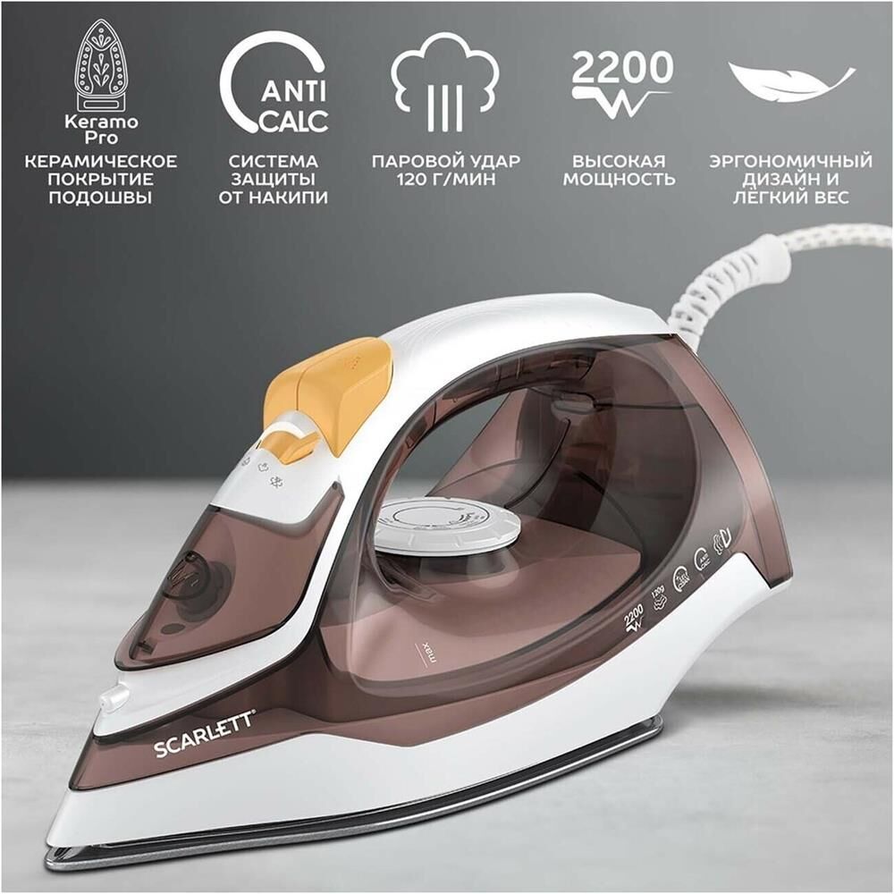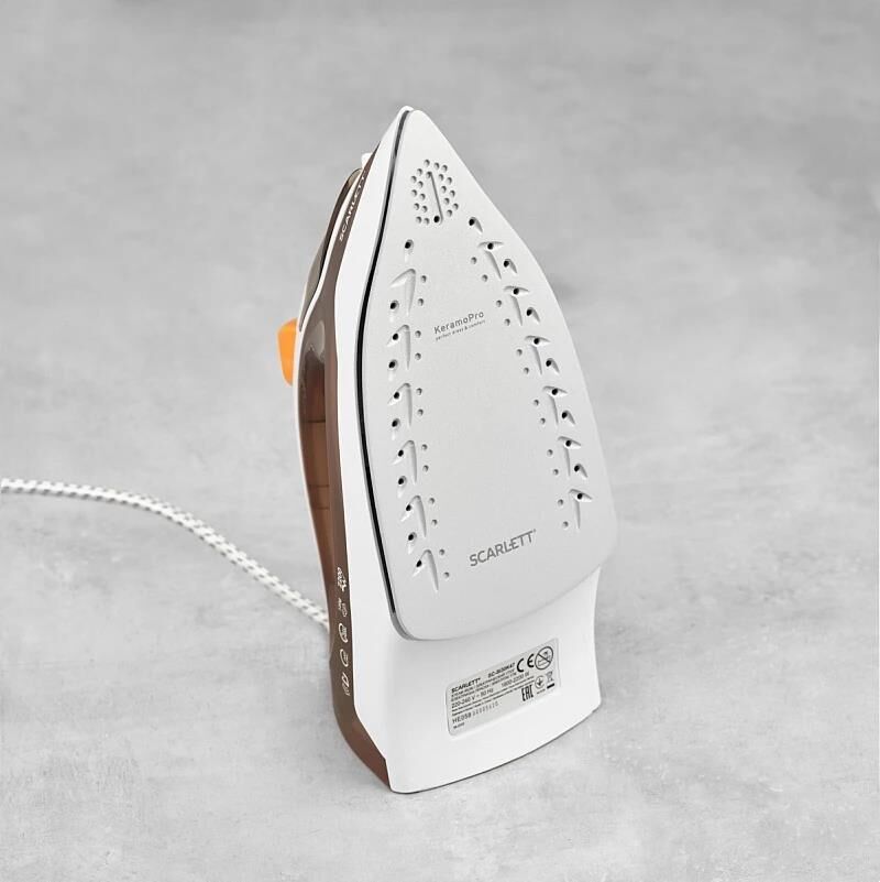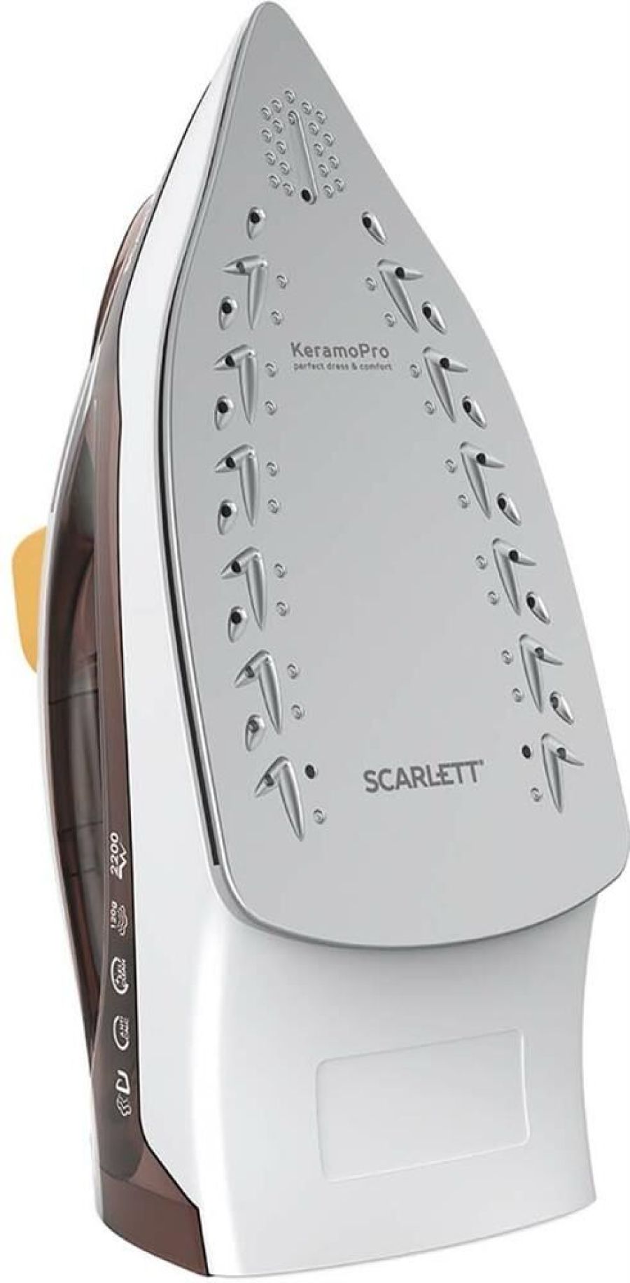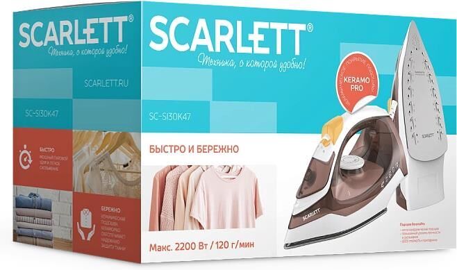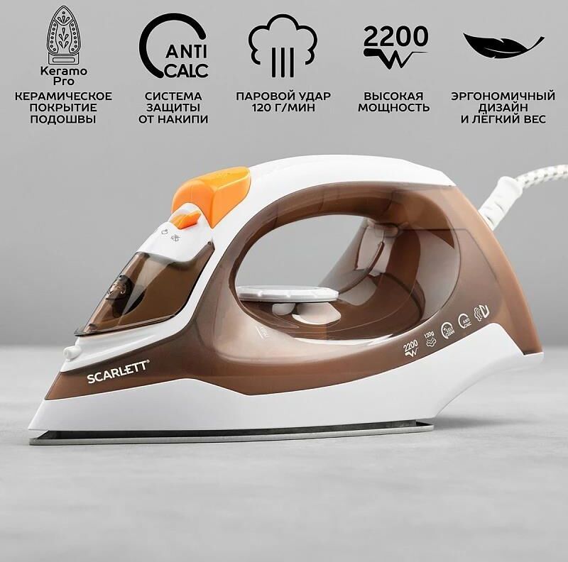 Мощность, Вт: 2200 Световой индикатор работы: Да Регулируемый пар до г/мин: 60 Паровой удар до г/мин: 120 Резервуар для воды, мл: 250 Функция разбрызгивания воды: Да Терморегулятор: Да Вертикальное отпаривание: Да Регулировка степени отпаривания: Да Покрытие подошвы: Керамическая подошва KeramoPro Самоочистка: Да Система защиты от накипи ANTI-CALC: Да Размер утюга Ш*В*Г, мм: 280*118*136 Шарнирное крепление шнура: Да Длина электрошнура, м: 1.6 Цвет: Коричневый Утюг Scarlett SC-SI30K47, выполненный в коричневом цвете, оснащён подошвой с керамическим покрытием KeramoPro, которая обеспечивает отличное скольжение и бережное отношение ко всем видам тканей. Максимальная мощность 2200 Вт позволит в считанные минуты справиться даже с тканями со сложной фактурой, а различные температурные режимы помогут выбрать оптимальный для того, чтобы самые деликатные ткани выглядели после глажения идеально. В режиме парового удара создает 120 грамм пара в минуту