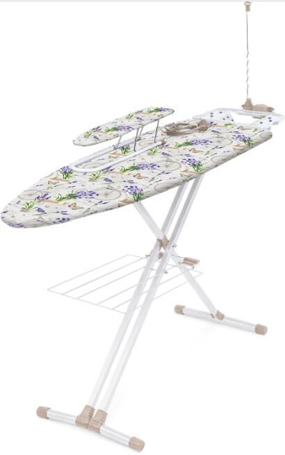 Гладильная доска с электросоединителем и подставкой под утюг, регулируемая по высоте. Удобная полка для белья и переносной подрукавник.
