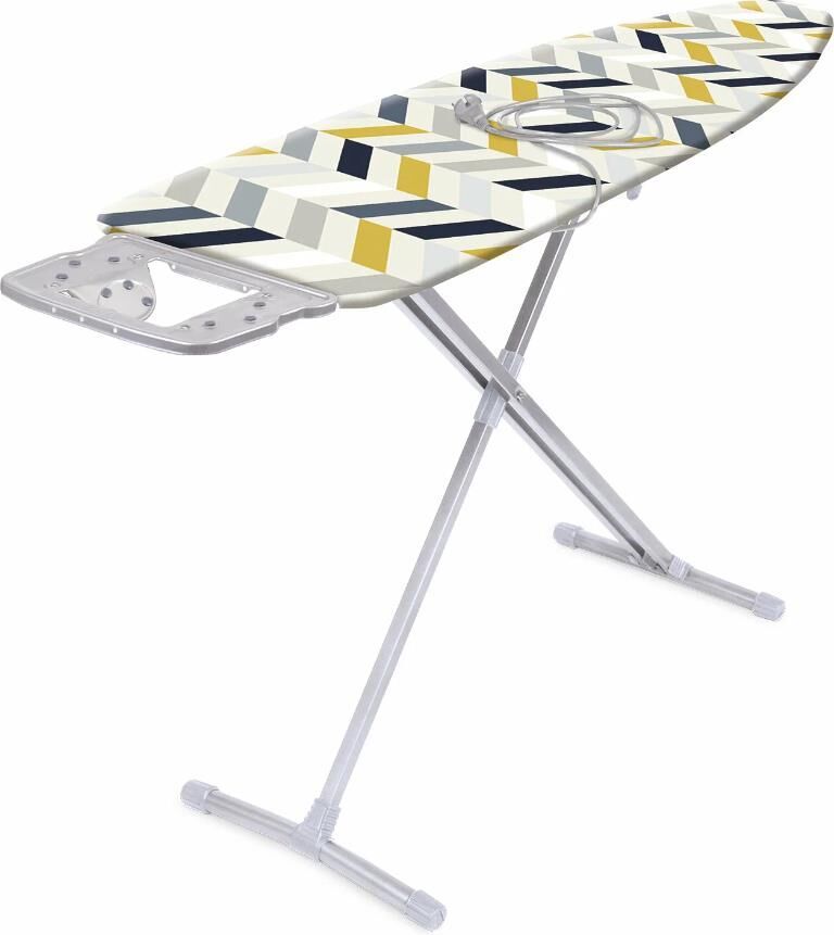 Размер рабочей поверхности 122х40см.Надёжная металлическая поверхность с отверстиями для пара Съёмный чехол из хлопка Плавно регулируемая высота до 0,9 м Подставка под утюг с термоустойчивыми вставками Электрический соединитель 1,6 м Устойчивые опоры с пластиковыми наконечниками для защиты напольного покрытия Фиксация в сложенном виде Максимальная нагрузка на гладильную поверхность - 25 кг