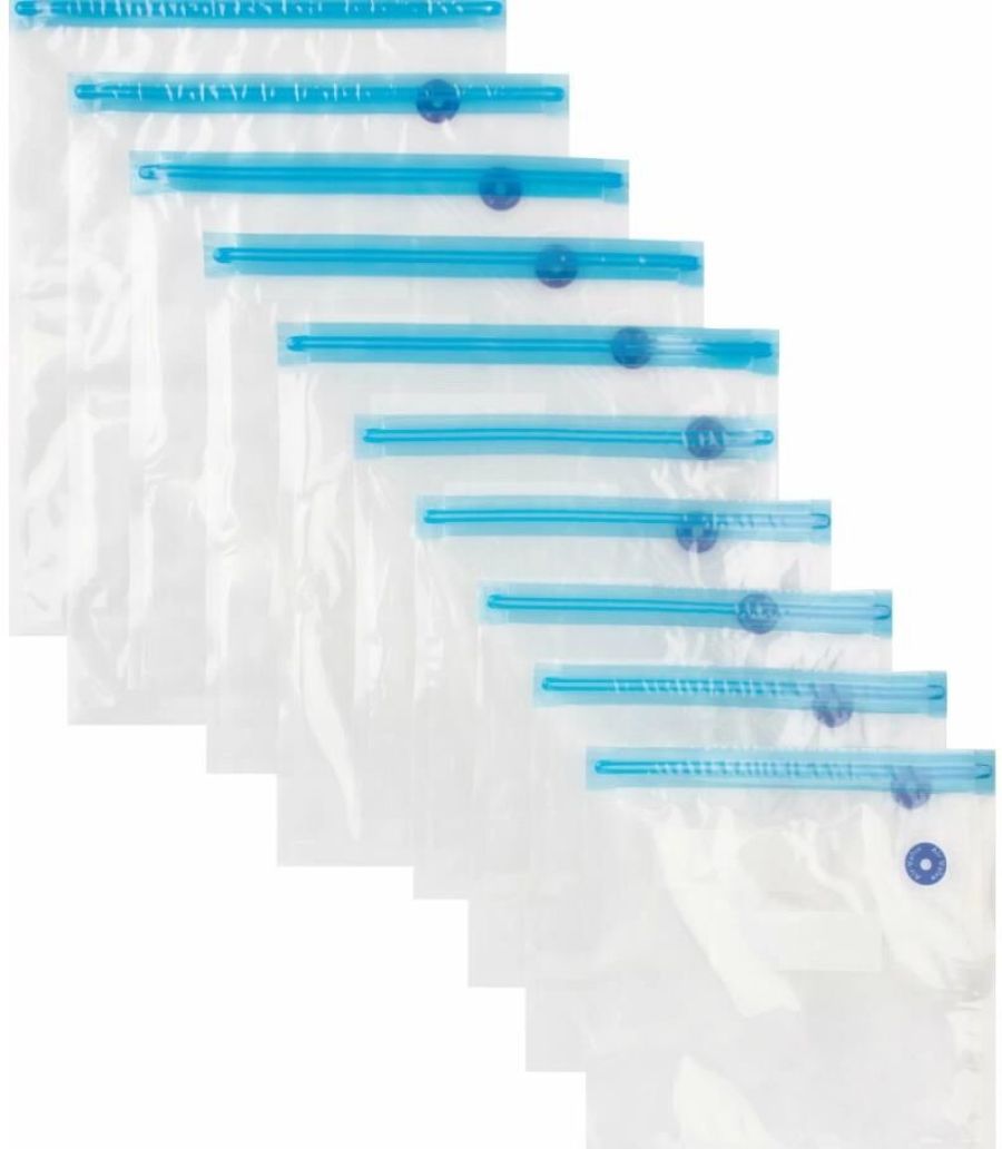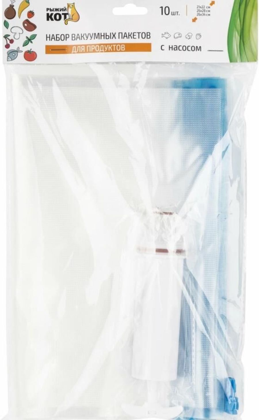 насос - 1шт размер 26x34 см (0,9 л) - 2 шт размер 26x28 см (0,7 л) - 3 шт размер 22x21 см (0,5 л) - 5 шт клипса для закрывания - 2 шт материал: полиамид, полиэтилен, пластмасса Упаковка: пакет, хедер