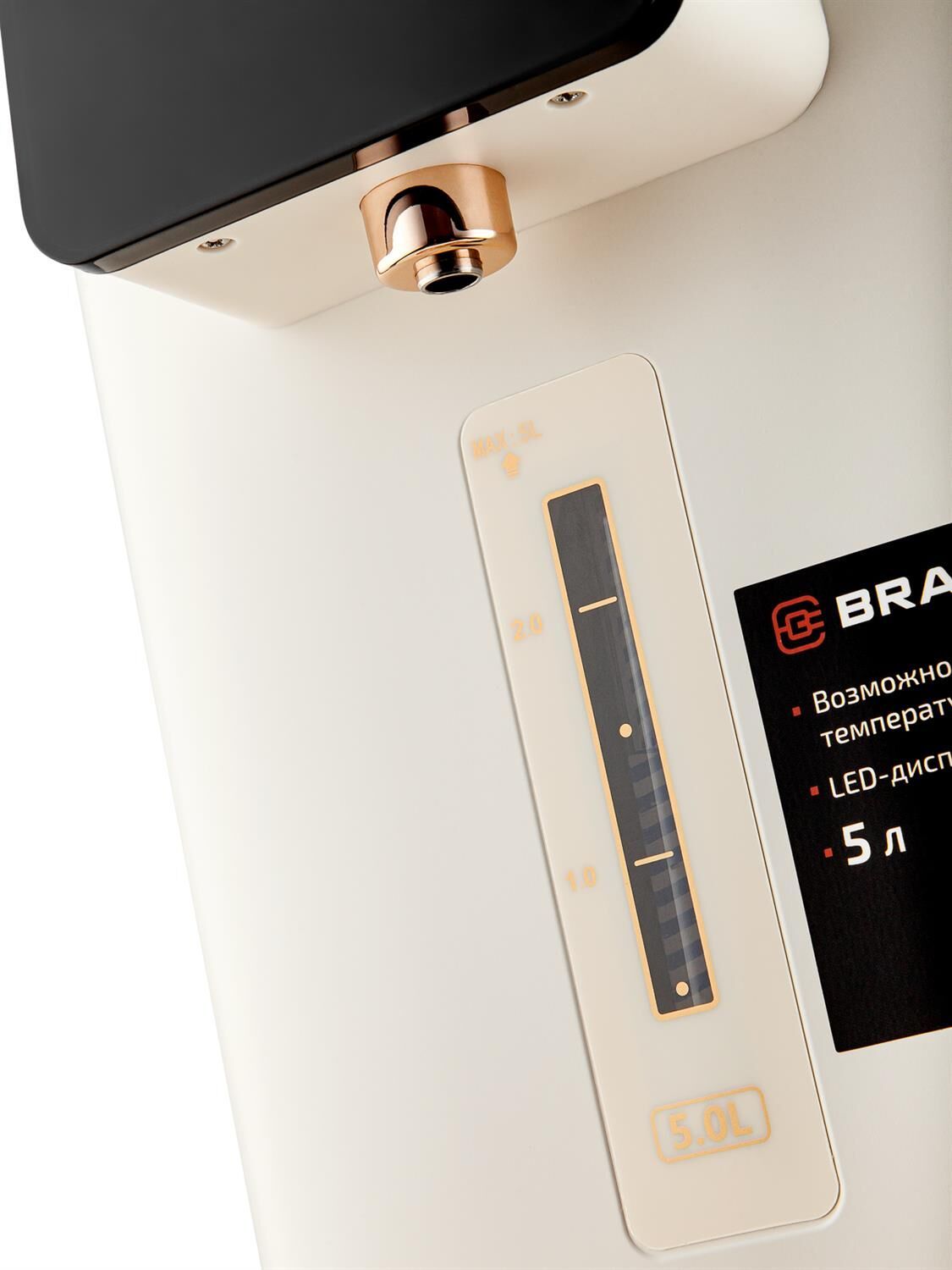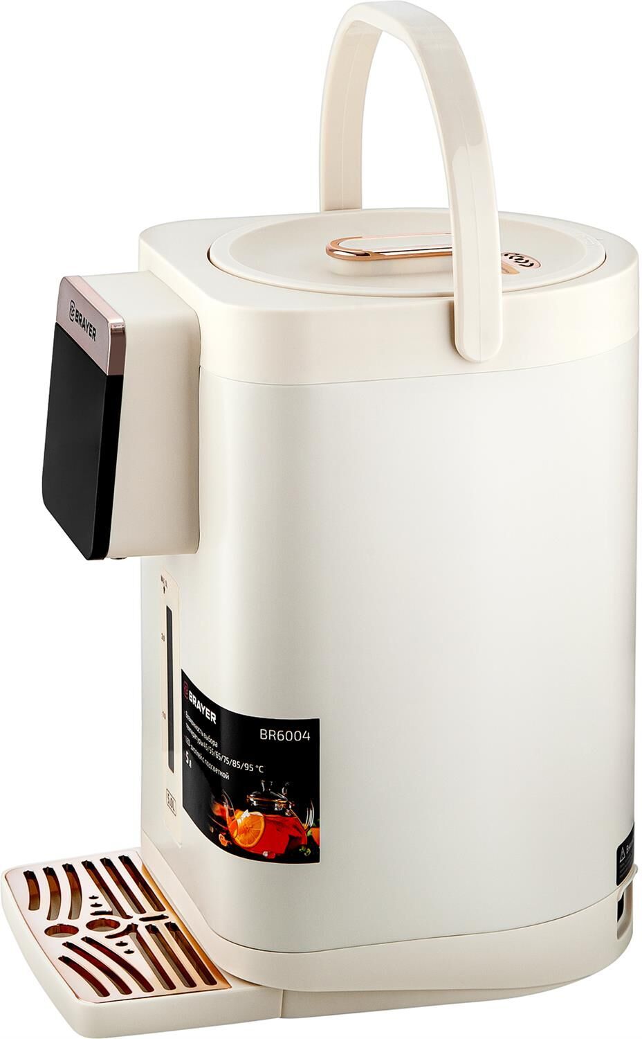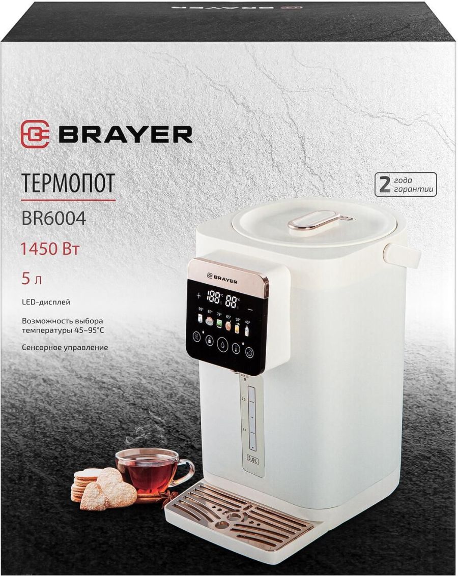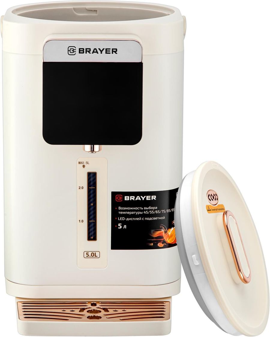 Максимальная мощность 1450 Вт Максимальный объем 5 л Подача воды с помощью автоматической помпы Поддержание температуры воды для разных напитков (45°/55°/65°/75°/85°/95°С) Функция повторного кипячения Функция поддержания температуры воды Сенсорное управление LED-дисплей Блокировка подачи воды Корпус из высококачественного металла Съёмный поддон для капель Автоотключение при отсутствии воды Электропитание 220-240 В, ~ 50-60 Гц